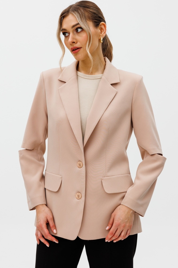 Жакет полуприлегающего силуэта из костюмной ткани с воротником пиджачного типа. Застежка однобортная на две петли и пуговицы По переду талиевая вытачка и рельеф. В районе талии настрочной клапан. Спинка со средним швом и рельефом. Рукав втачной двухшовный с прорезью в районе локтя. Жакет частично на подкладке. Длина жакета - 70 см. , длина рукава - 60 см. Рост 164 см.