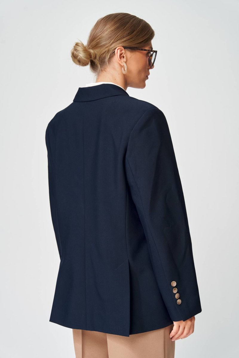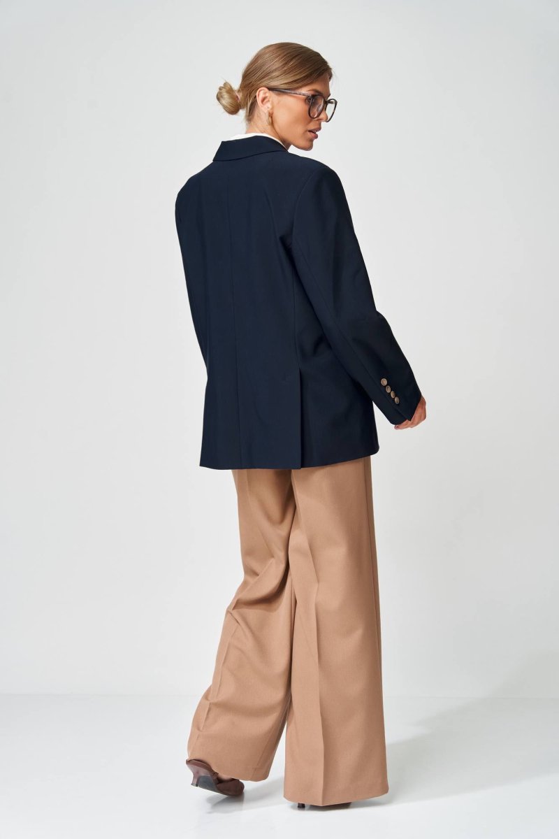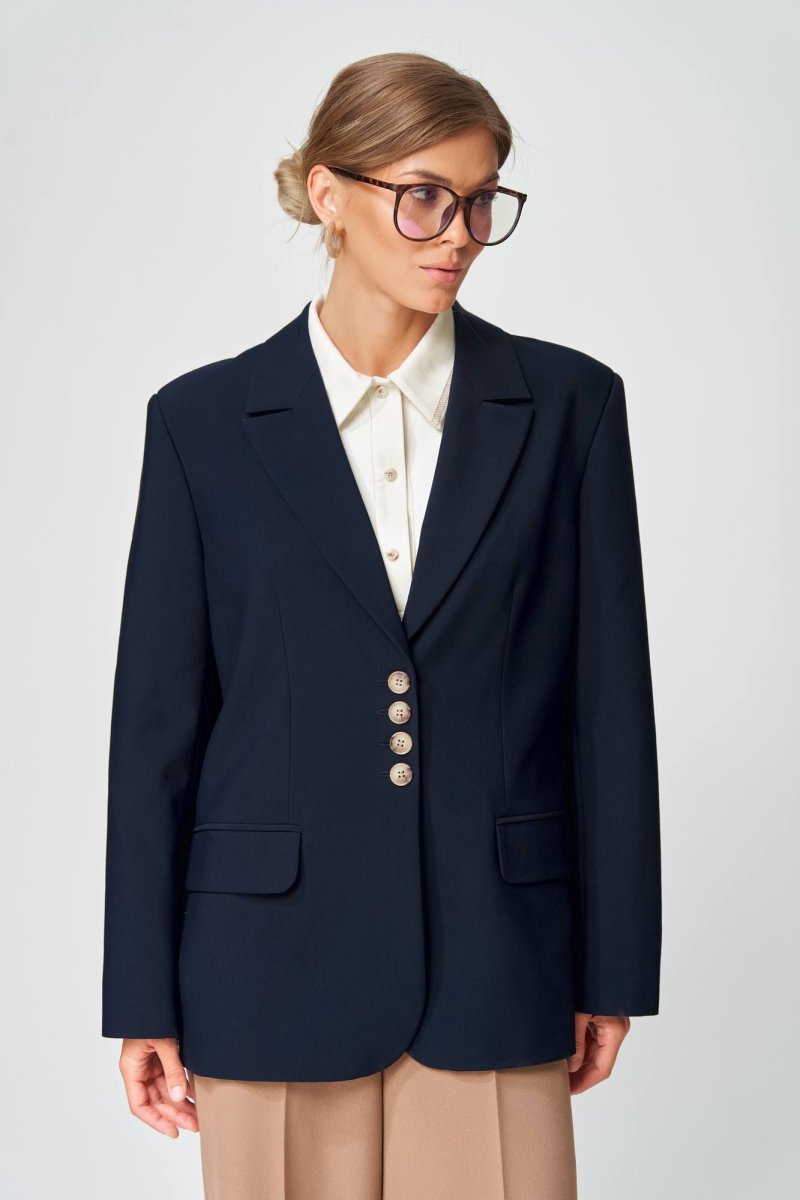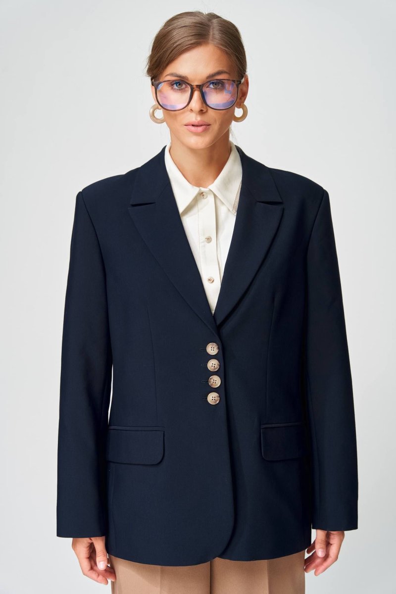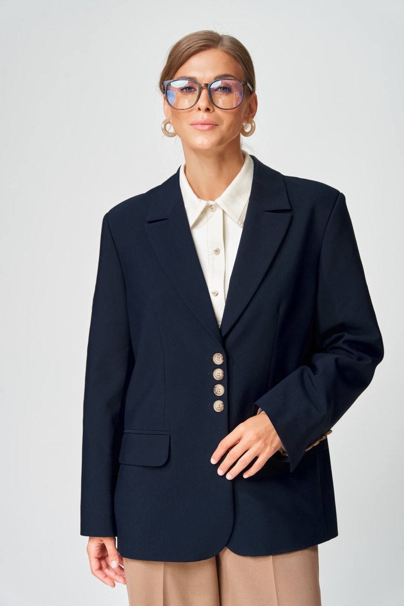 Жакет прямого свободного силуэта оверсайз. Воротник пиджачного типа, застежка обнобортная на 4 петли и пуговицы. Перед с талиевой вытачкой и карманом с клапаном в рамку, с рельефом. Спинка со средним швом и рельефами, в рельефах шлица. Рукав втачной одношовный со шлицей и 4-мя пуговицами. Жакет на подкладке. Длина жакета- 70 см, длина рукава жакета - 60 м. Данная модель прекрасно сочетается с другими моделями из нашей коллекции 15409, 35204. Создайте гармоничный образ, комбинируя эти изделия!