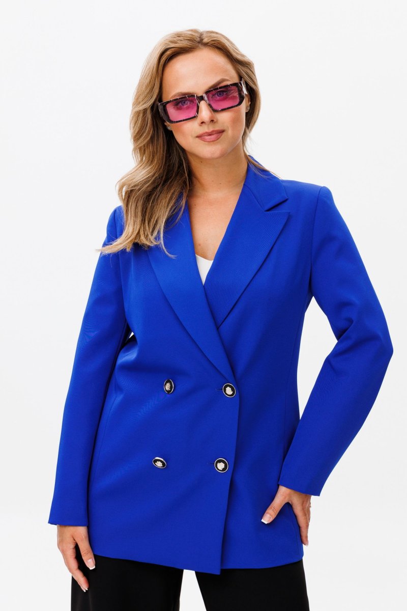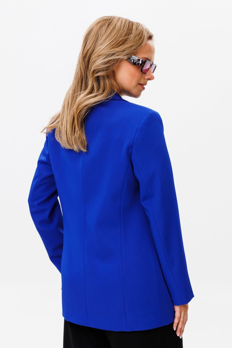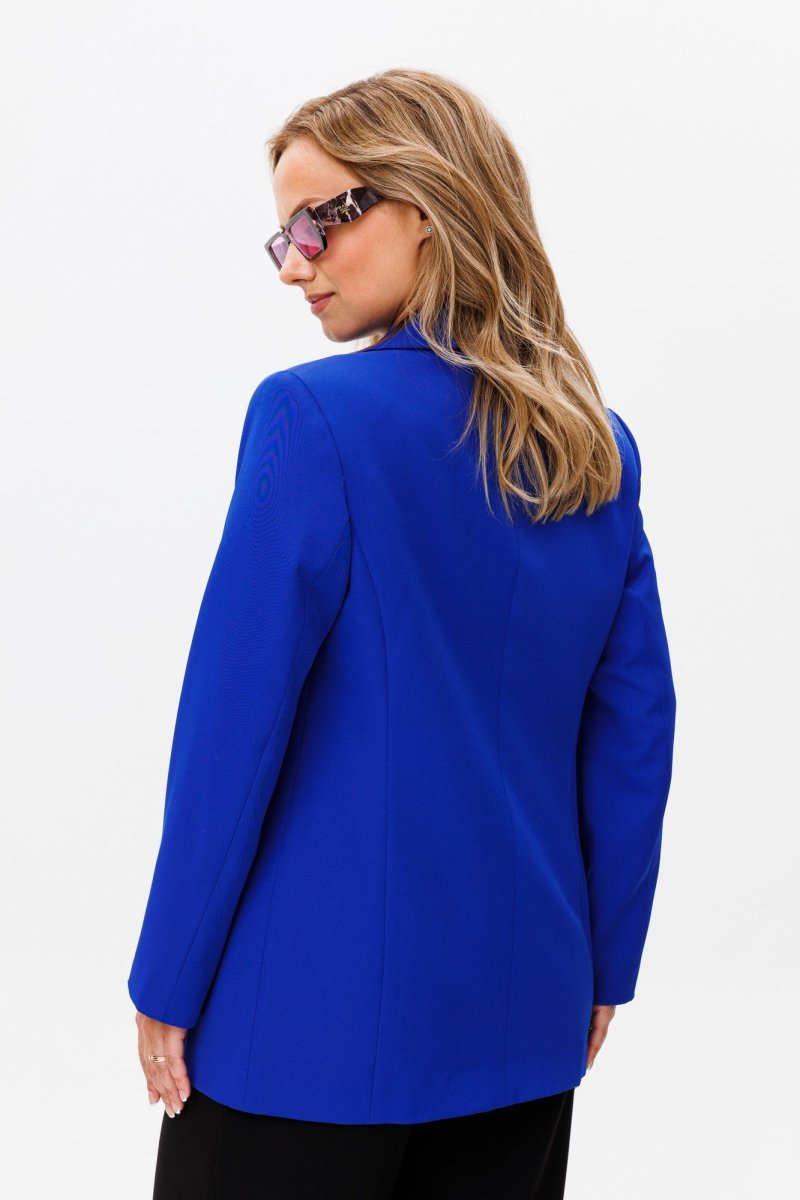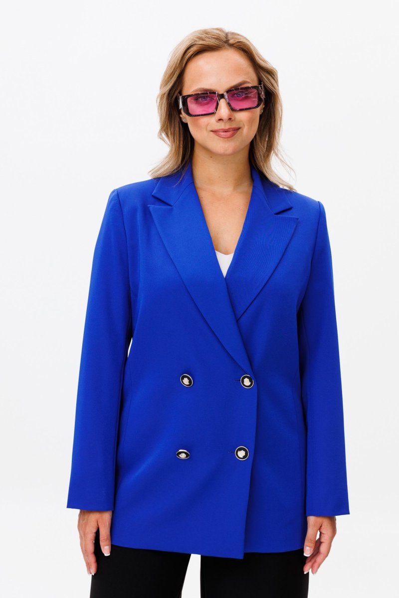 Жакет свободного силуэта, с двубортной с застежкой на четыре пуговицы. Полочки с отрезными бочками, с нагрудной вытачкой из горловины закрытой лацканом. Спинка со средним швом и двумя отрезными бочками. Рукав двухшовный втачной. Жакет на подкладке. Длина жакета 72 см, рукава - 60 см