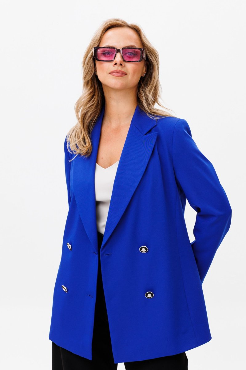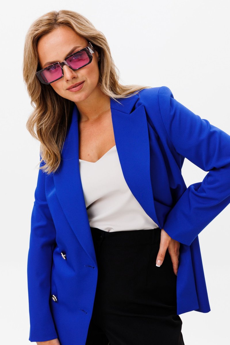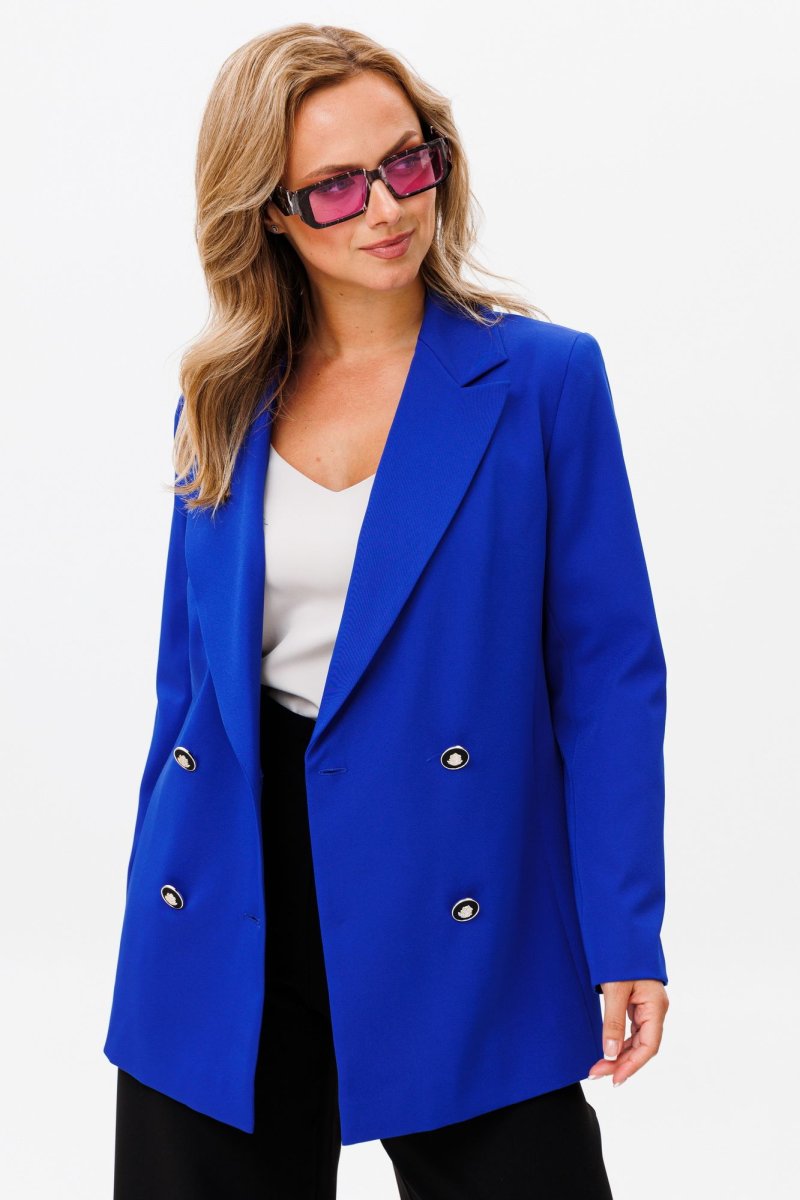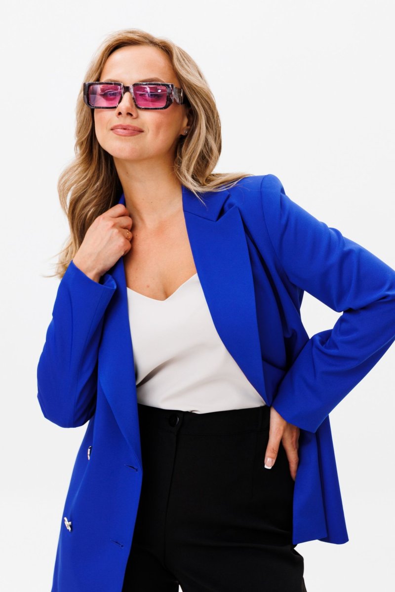 Жакет свободного силуэта, с двубортной с застежкой на четыре пуговицы. Полочки с отрезными бочками, с нагрудной вытачкой из горловины закрытой лацканом. Спинка со средним швом и двумя отрезными бочками. Рукав двухшовный втачной. Жакет на подкладке. Длина жакета 72 см, рукава - 60 см