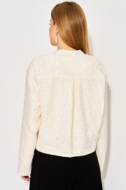 Жакет длиной до линии бедер с центральной застёжкой на декоративную тесьму-молнию. Вырез горловины «под горло», с втачной стойкой из отделочной ткани. Детали переда с отрезными бочками, в швах обработаны карманы, центральные части с нагрудными вытачками. Деталь спинки блузона с кокеткой, на нижней части по центру в шве обработана складка. Рукава втачные одношовные, линия плеча спущена. Низ жакета обработан обтачкой.