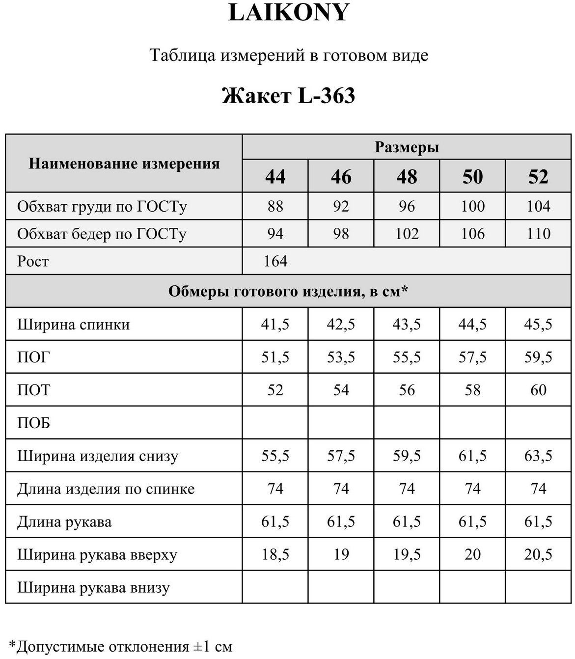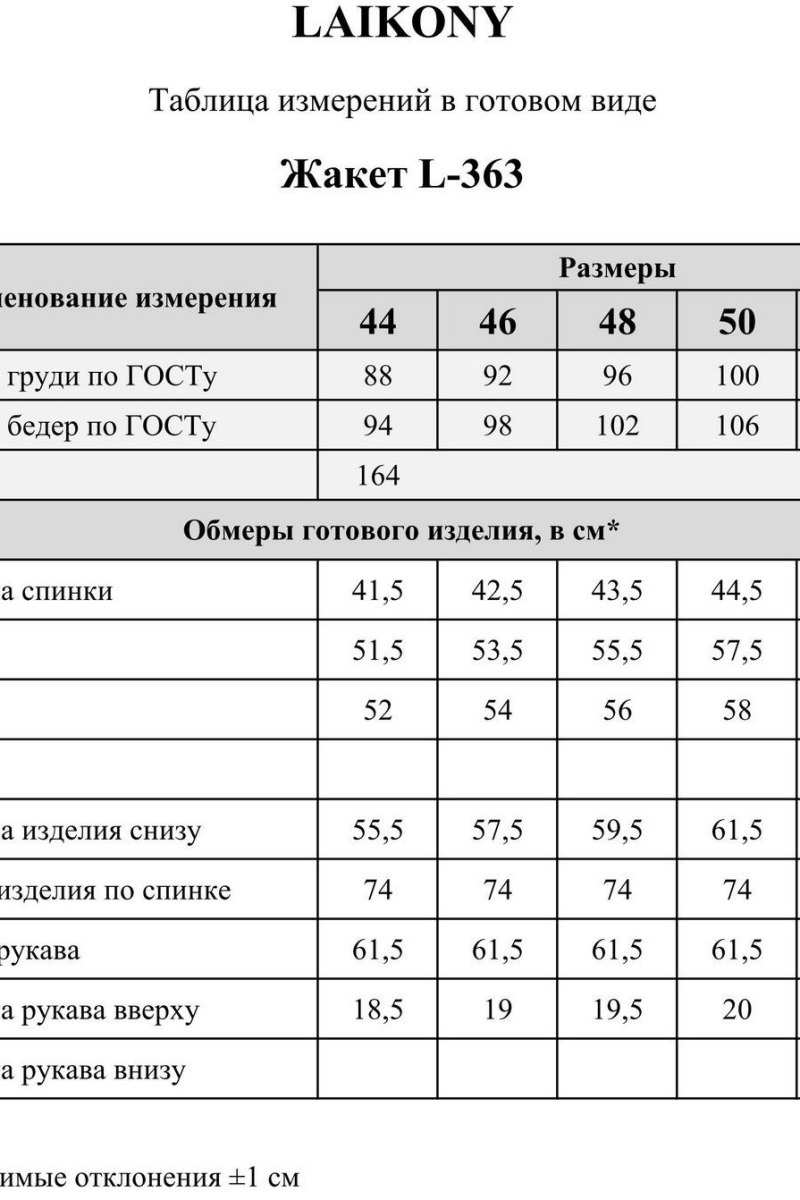 Таблица размеров