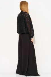Жакет длиной до линии бедер с центральной сквозной застёжкой на декоративную тесьму-молнию. По центру горловины спинки обработана складка. Рукава втачные одношовные, со сборкой по низу и с притачными манжетами из декоративной эластичной тесьмы. Вырез горловины «под горло», с втачной стойкой из отделочной эластичной тесьмы. Низ блузона со сборкой и с притачной манжетой из эластичной тесьмы.