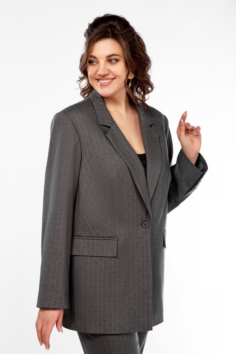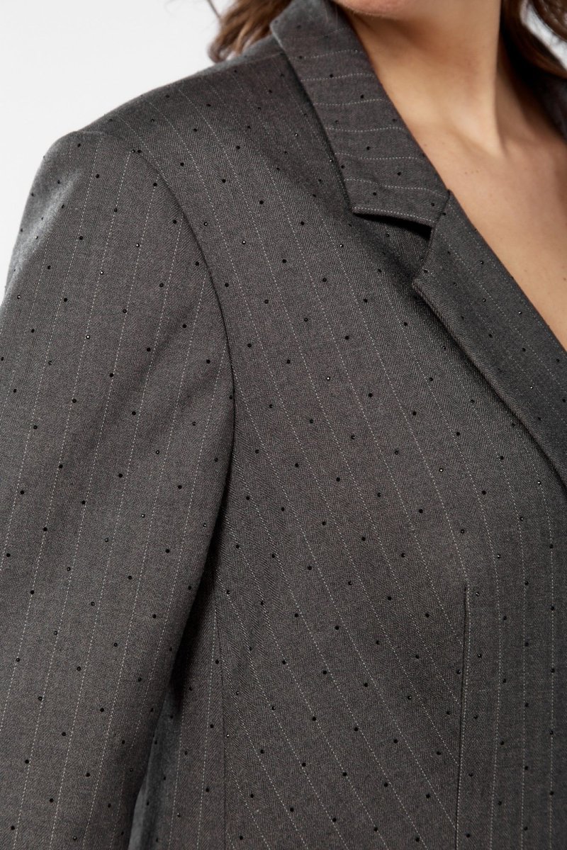 Жакет удлиненный прямого силуэта из ткани -елочка с тонкой полоской, жакет украшен стразами по всей ткани. Воротник с лацканами, застежка на петлю и пуговицу, полочка с рельефными вытачками, карманами в рамку и клапанами. Спинка со средним швом. Рукав длинный, двухшовный. Жакет полностью на подкладке.