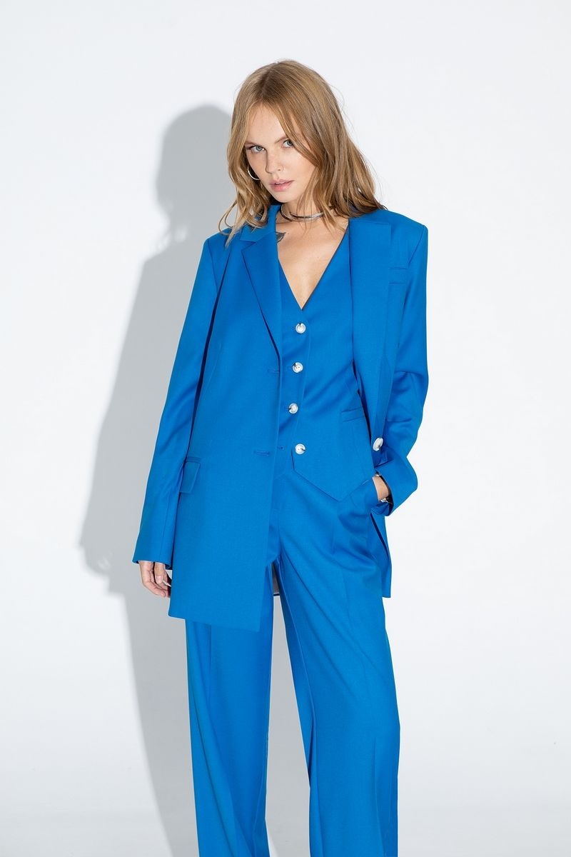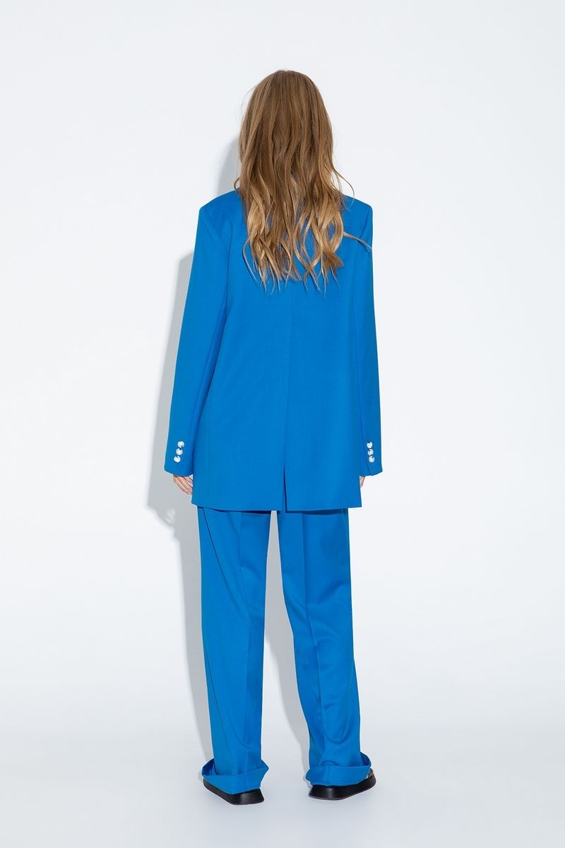 Трапециевидный жакет свободного покроя из текстильной ткани. Детали: пиджачный воротник, талиевые вытачки, функциональный нагрудный карман, прорезные карманы с клапанами, застежка на пуговицы, спинка со средним швом и высокой шлицей, рукава втачные двухшовные, жакет на подкладке Длина по спинке около 75 в размерах 40-46 и около 78 см в размерах 48-52, длина рукавов около 61 см