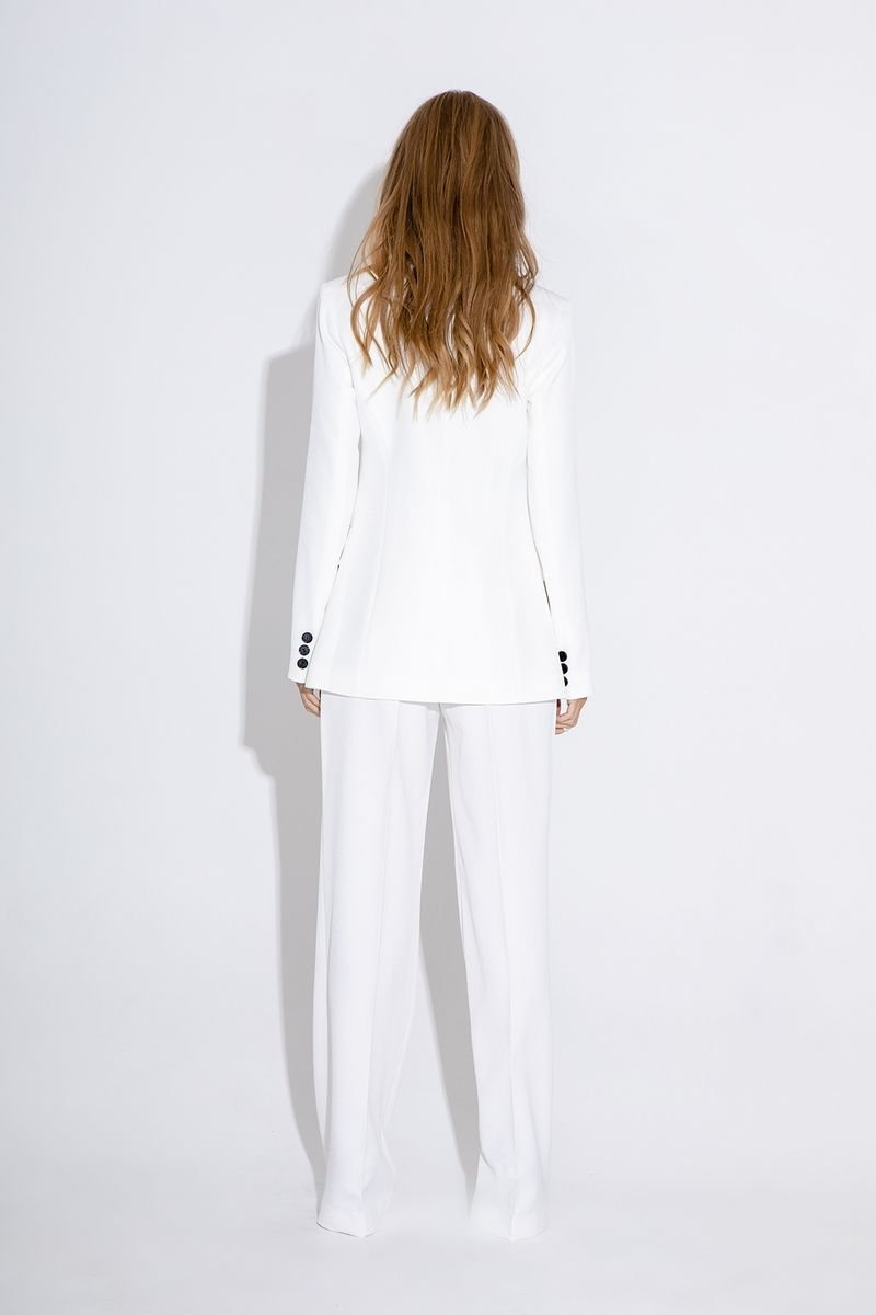 Классический приталенный жакет из текстильной ткани. Детали: жакет с отрезными бочками и нагрудными вытачками, пиджачный воротник, прорезные карманы, двубортная застежка на петли и пуговицы, спинка со средним швом, втачные двухшовные рукава, жакет на подкладке Длина по спинке около 68 в размерах 40-46 и около 71 см в размерах 48-52, длина рукавов около 61 см
