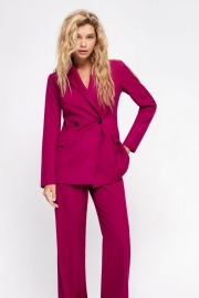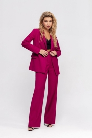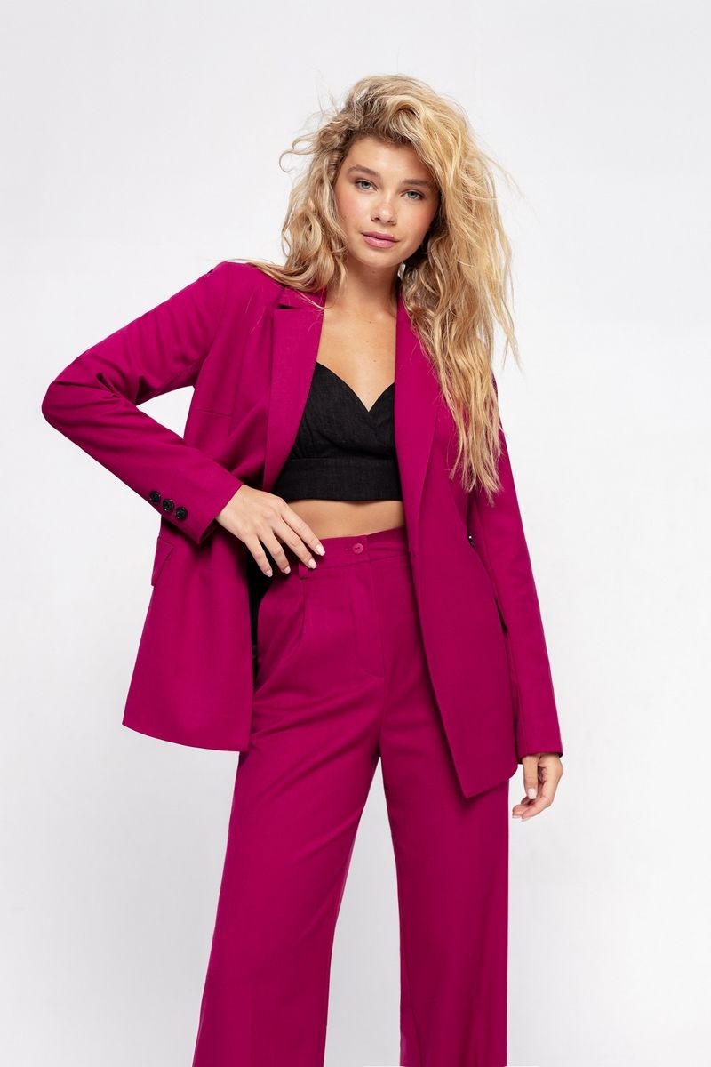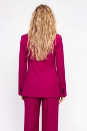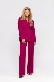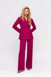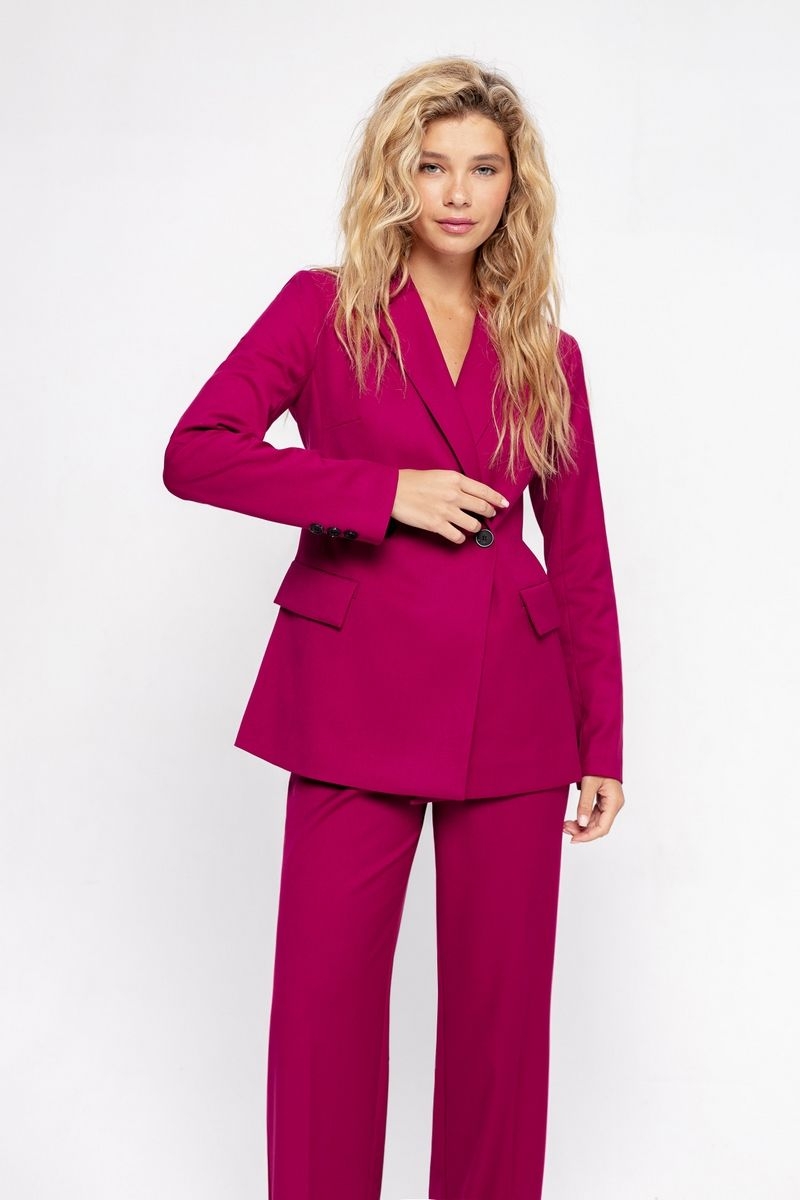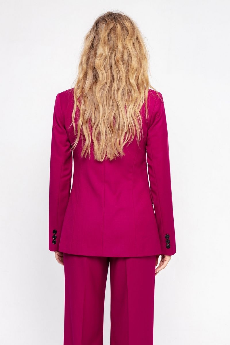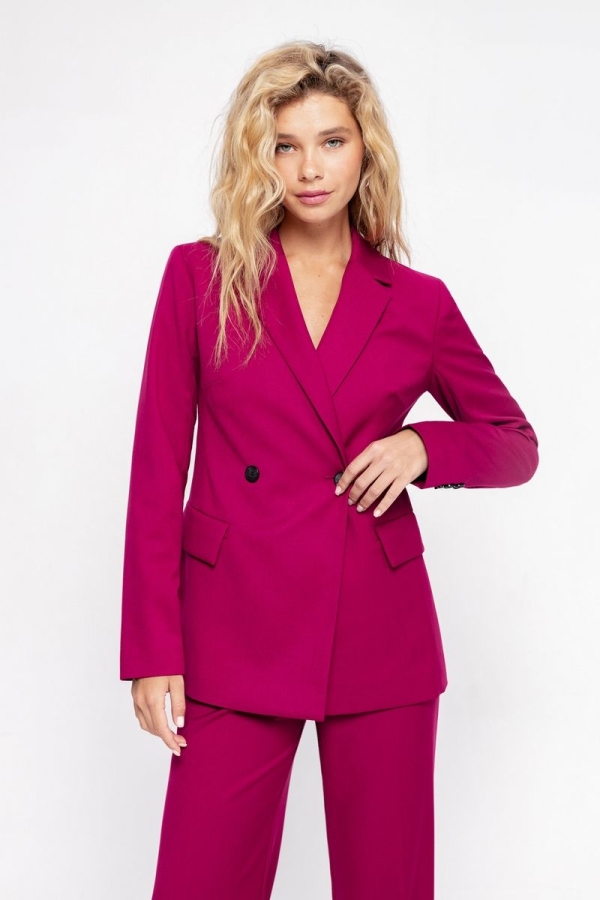Классический приталенный жакет из текстильной ткани. Детали: жакет с отрезными бочками и нагрудными вытачками, пиджачный воротник, прорезные карманы, двубортная застежка на петли и пуговицы, спинка со средним швом, втачные двухшовные рукава, жакет на подкладке Длина по спинке около 68 в размерах 40-46 и около 71 см в размерах 48-52, длина рукавов около 61 см