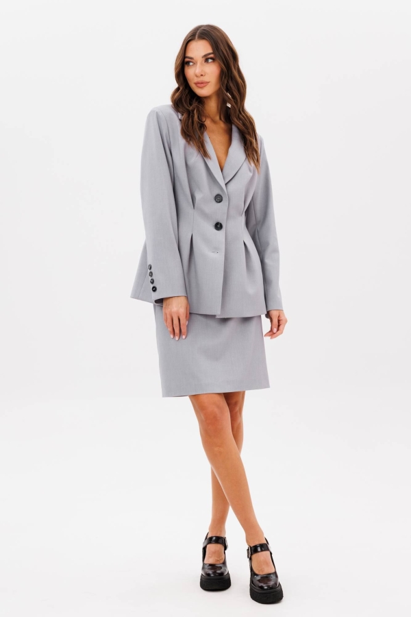 Текстильный жакет со шлицами Детали: полуприлегающий силуэт, пиджачный воротник, талиевые вытачки, функциональные карманы, застежка на петли и пуговицы, спинка со средним швом, рукава втачные двухшовные, жакет на подкладке из 100% вискозы Длина по спинке около 70 см в размерах 40-46 и около 72 см в размерах 48-52