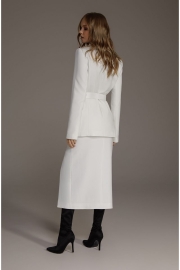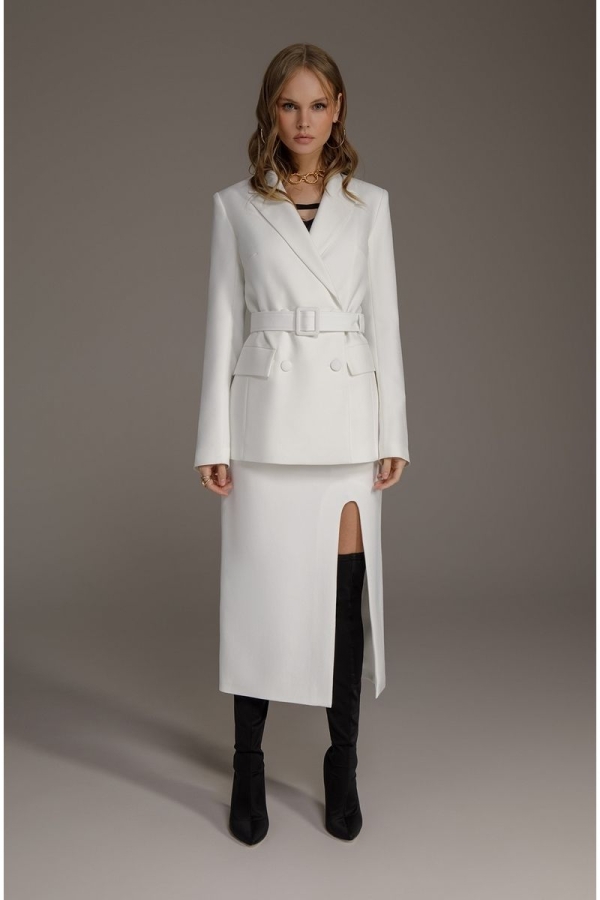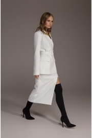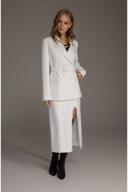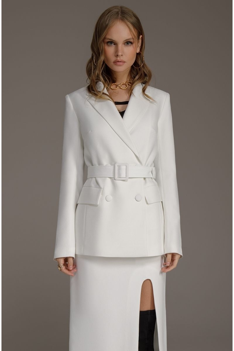 Двубортный приталенный жакет со съемным поясом из текстильной ткани. Детали: пиджачный воротник, прорезные карманы, застежка на петли и пуговицы, спинка со средним швом, втачные двухшовные рукава, жакет на подкладке Длина по спинке около 68/71 см, длина рукава около 61 см