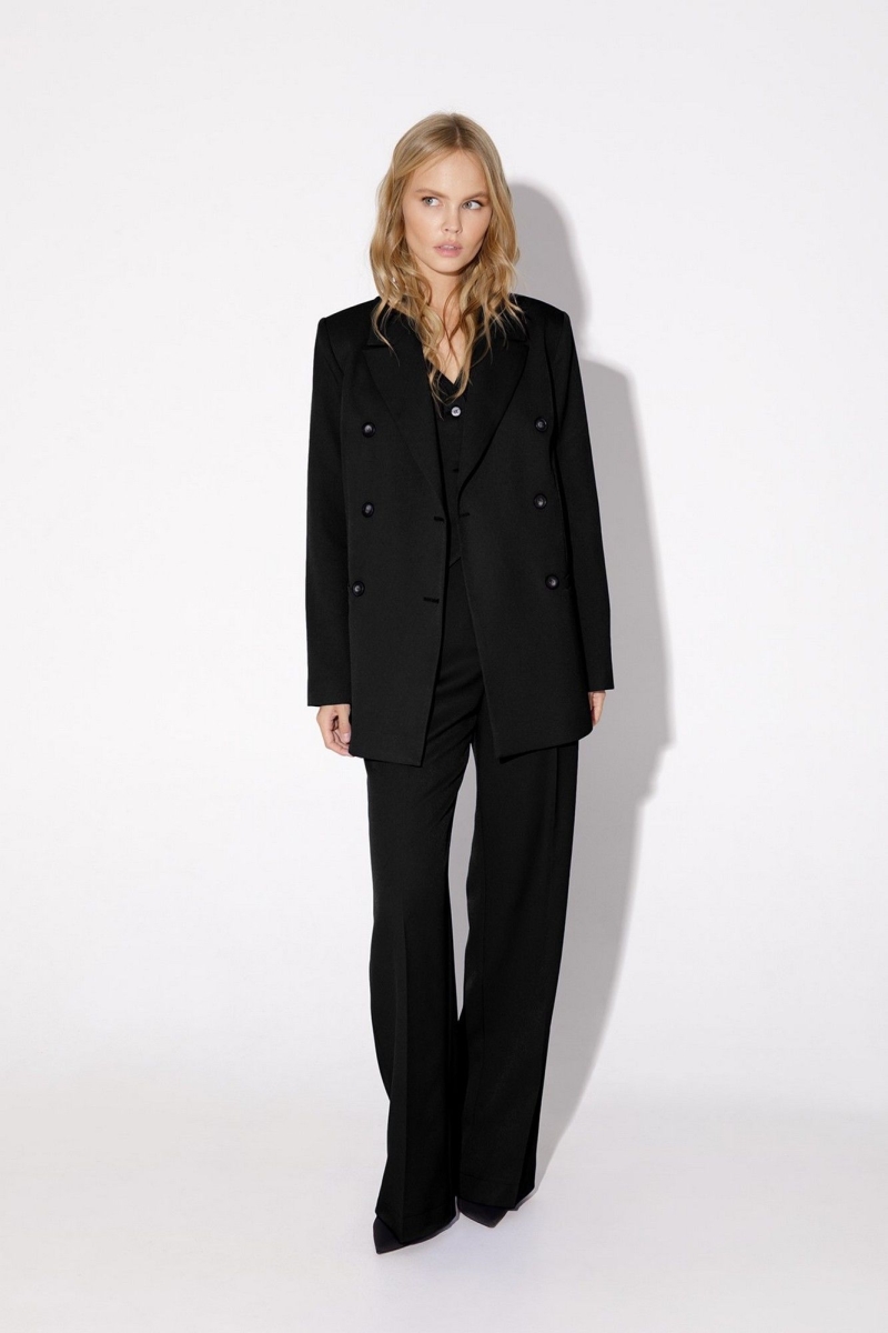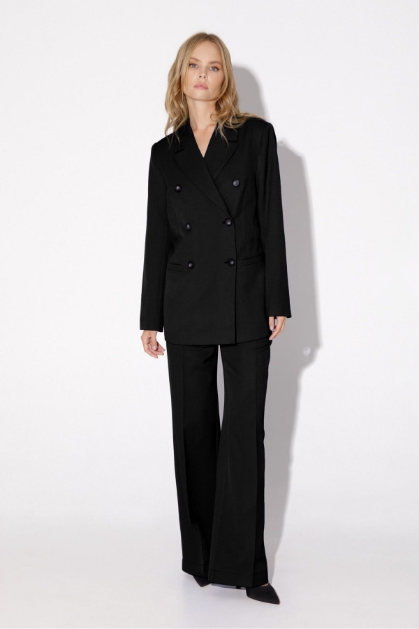 Классический двубортный жакет из текстильной ткани. Детали: жакет полуприлегающего силуэта, пиджачный воротник, перед с прорезными карманами, двубортная застежка на петли и пуговицы, спинка со средним швом, рукава втачные двухшовные, жакет на подкладке. Длина жакета по спинке около 66 см в размерах 40-46 и около 69 см в размерах 48-52, длина рукавов около 61 см.
