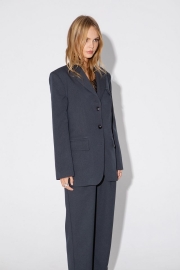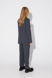 Свободный жакет с разрезами по низу рукавов. Детали: жакет прямого силуэта, пиджачный воротник, перед с прорезными функциональными карманами, нагрудный декоративный карман, однобортная застежка на петли и пуговицы, спинка со средним швом, рукава втачные двухшовные с разрезами по низу, жакет на подкладке. Длина жакета по спинке около 72 см в размерах 40-46 и около 74 см в размерах 48-52, длина рукавов около 62,5 см.