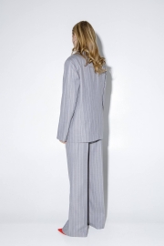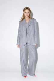 Однобортный оверсайз жакета из текстильной ткани. Детали: жакет прямого силуэта, расширенная линия плеч, пиджачный воротник, перед с прорезными функциональными карманами, однобортная застежка на петли и пуговицы, спинка со средним швом и шлицей, рукава втачные двухшовные, на подкладке. Длина жакета по спинке около 69 см в размерах 40-46 и около 72 см в размерах 48-52, длина рукавов около 62 см.