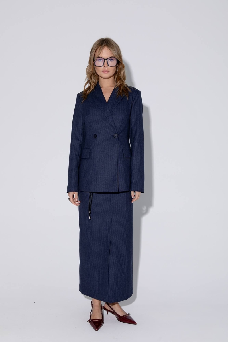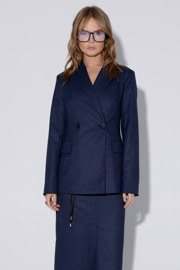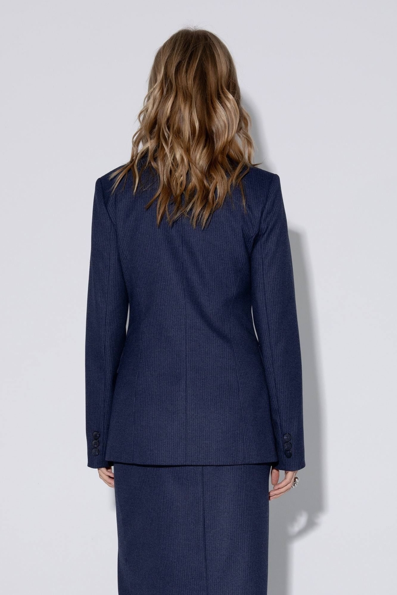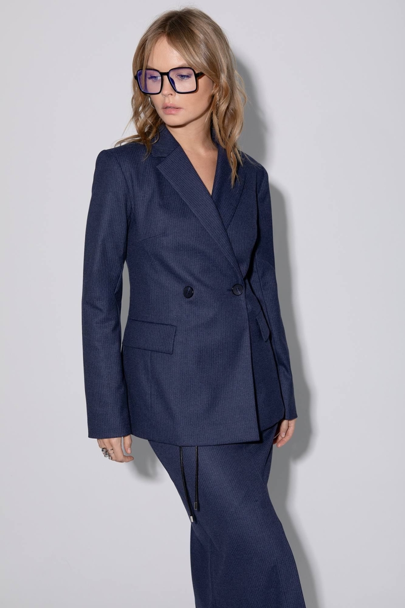 Приталенный двубортный жакет из текстильной ткани в тонкую полоску. Детали: жакет с отрезными бочками и нагрудными вытачками, пиджачный воротник, функциональные карманы, двубортная застежка на петли и пуговицы, спинка со средним швом, втачные двухшовные рукава, жакет на подкладке. Длина по спинке около 68 см в размерах 40-46 и около 71 см в размерах 48-52, длина рукава около 61 см