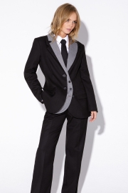 Асимметричный свободный жакет с двойным воротником. Детали: жакет свободного покроя и полуприлегающего силуэта, застежка на петли и пуговицы, функциональные карманы, на подкладке. Длина по спинке около 67 см в размерах 40-46 и около 69 см в размерах 48-52, длина рукава около 61 см