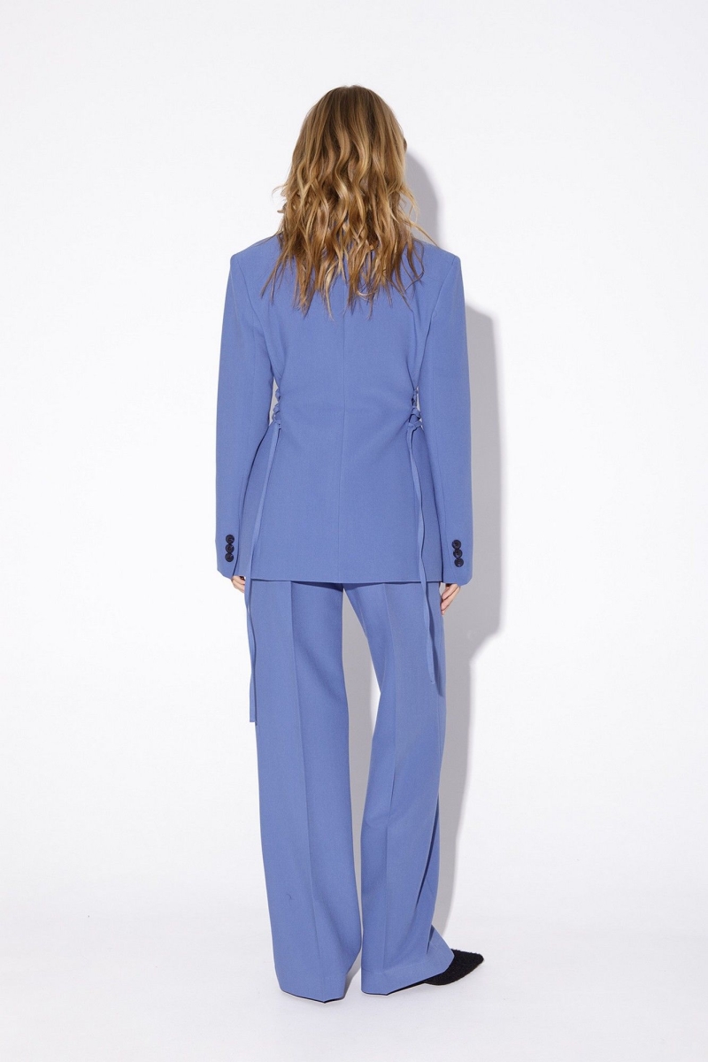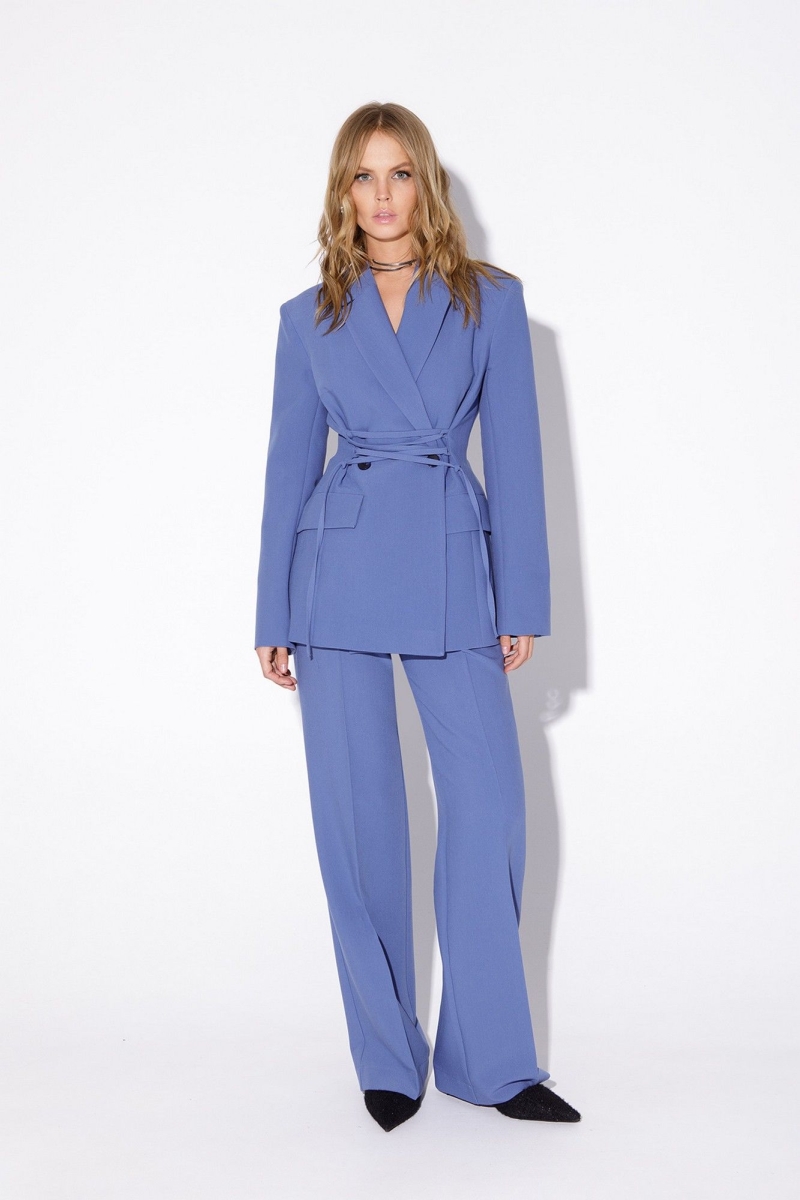 Жакет со шнуровкой и расширенной линией плеч. Детали: жакет полуприлегающего силуэта, рельефы, пиджачный воротник, застежка на две петли и пуговицы, функциональные карманы, жакет на подкладке. Жакет также можно зашнуровать по бокам. Длина по спинке около 69 в размерах 40-46 и около 72 см в размерах 48-52, длина рукавов около 61 см