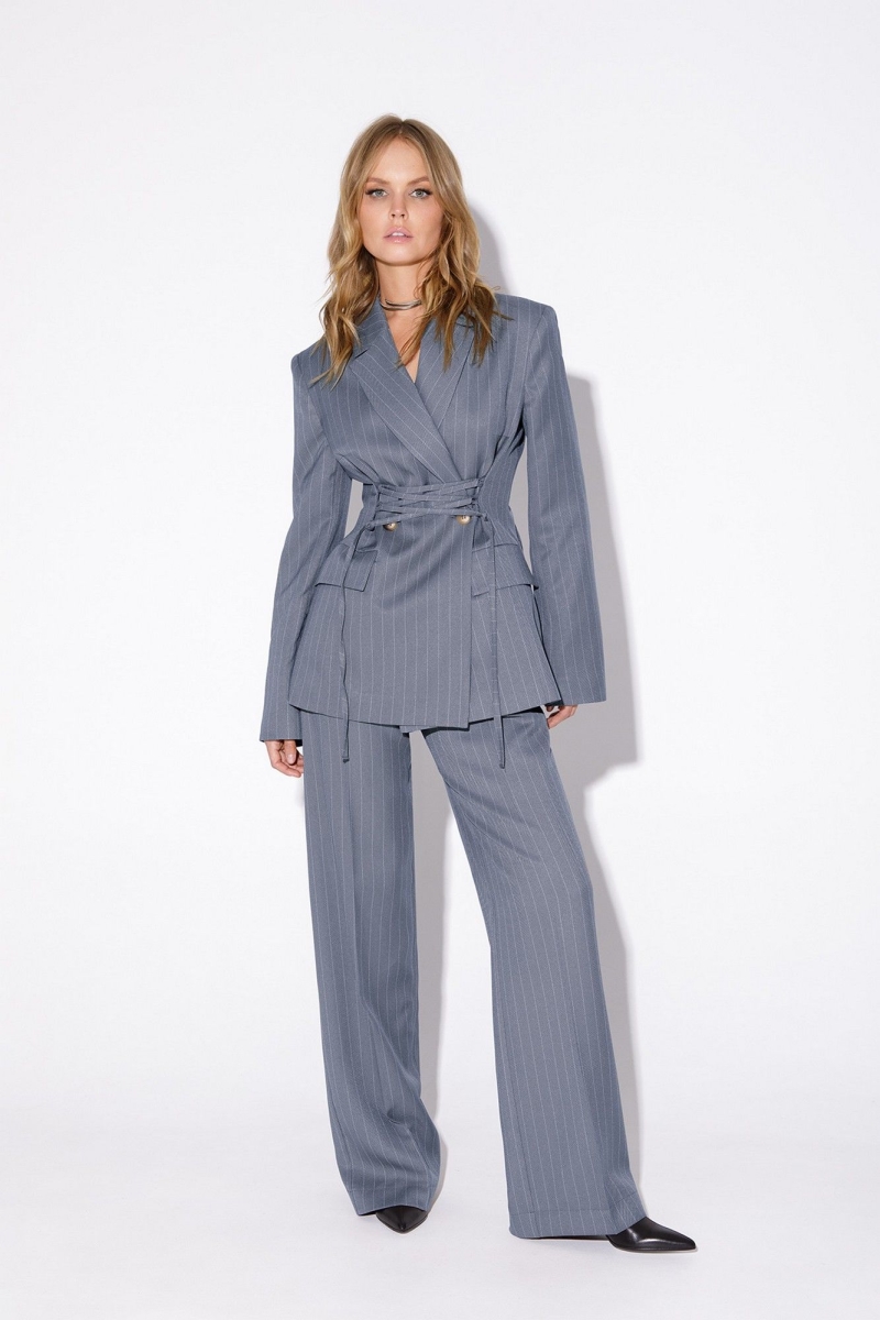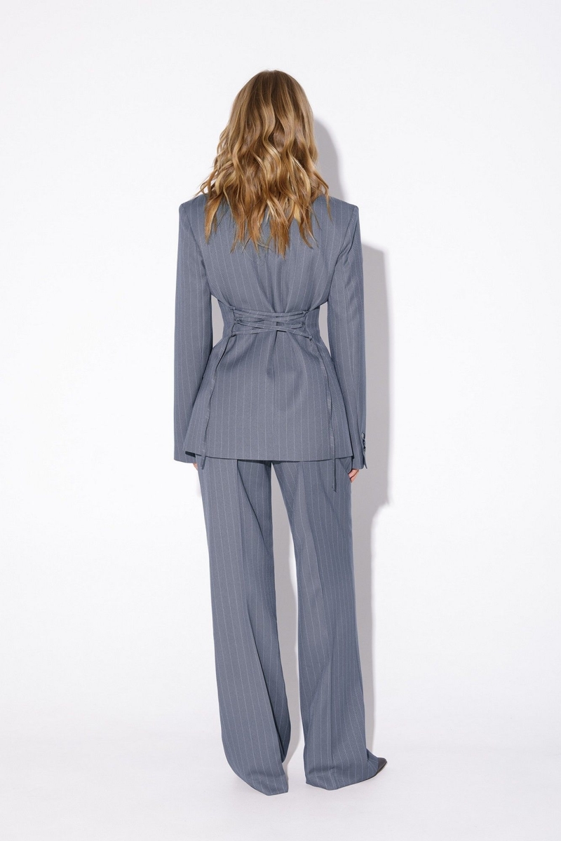 Жакет со шнуровкой из текстильной ткани в полоску. Детали: жакет полуприлегающего силуэта, расширенные плечи, рельефы, пиджачный воротник, застежка на две петли и пуговицы, функциональные карманы, жакет на подкладке. Жакет также можно зашнуровать по бокам. Длина по спинке около 69 в размерах 40-46 и около 72 см в размерах 48-52, длина рукавов около 61 см