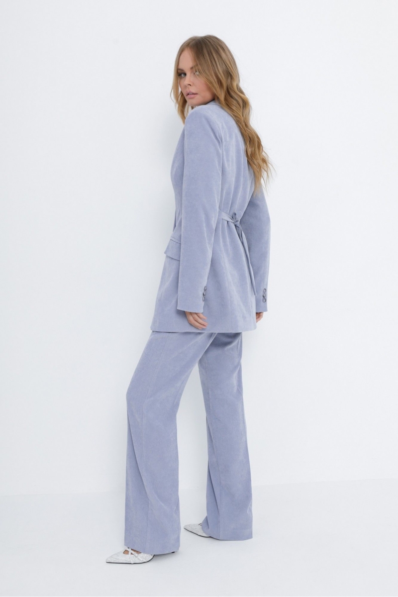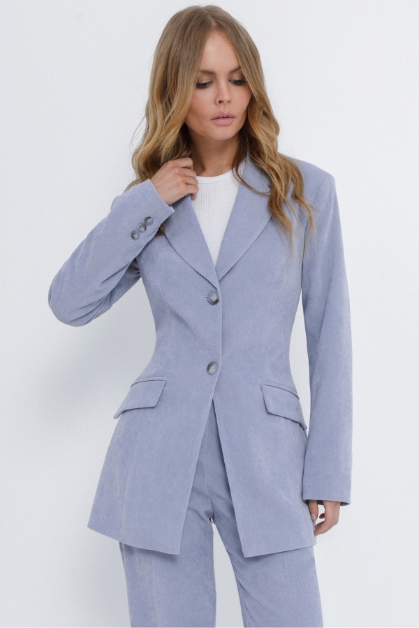 Удлиненный приталенный жакет из штруксовой ткани. Детали: пиджачный воротник, перед с функциональными карманами, застежка на петли и пуговицы, рукава втачные двухшовные, спинка с рельефами и регулировкой-завязками по талии. Жакет на подкладке. Длина по спинке около 75 см в размерах 40-46 и около 78 см в размерах 48-52, длина рукава около 61 см.