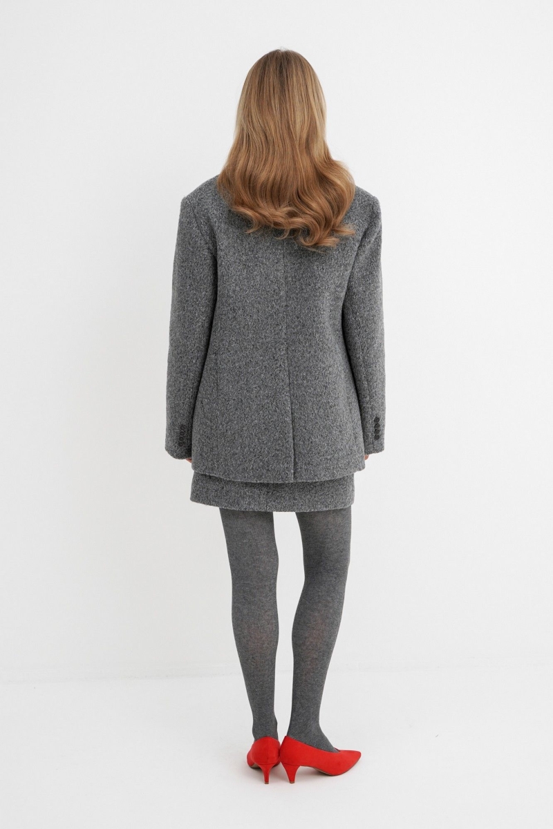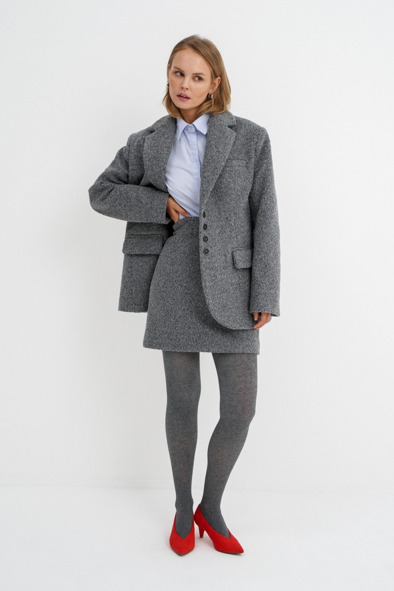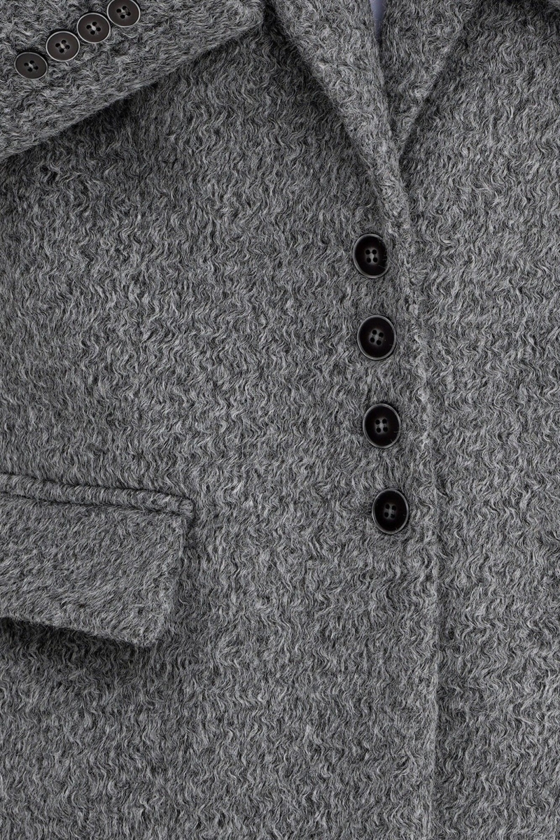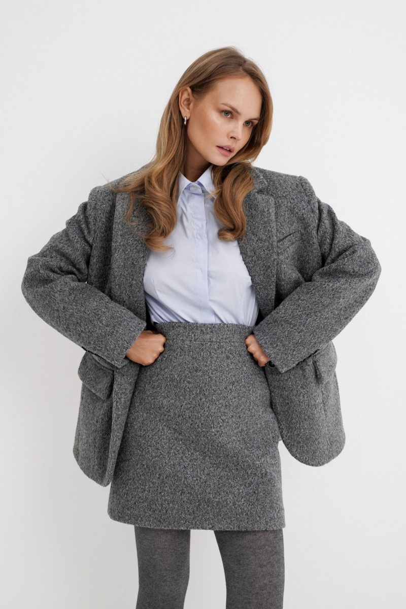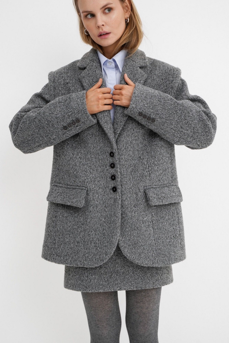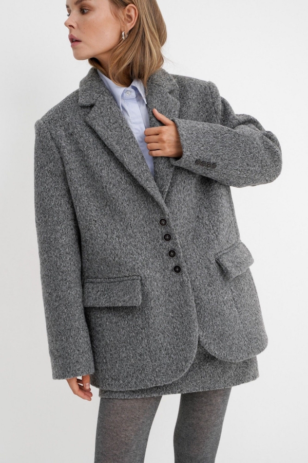 Жакет прямого силуэта, расширенная линия плеч, пиджачный воротник, перед с прорезными функциональными карманами, однобортная застежка на петли и пуговицы, спинка со средним швом и шлицей, рукава втачные двухшовные, жакет на подкладке.