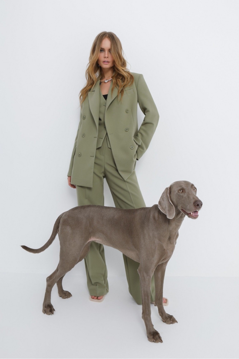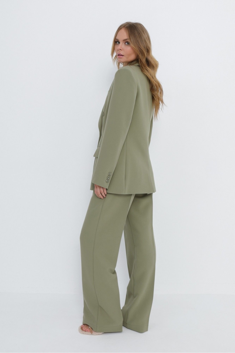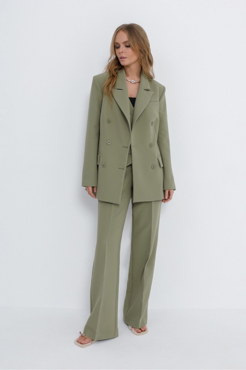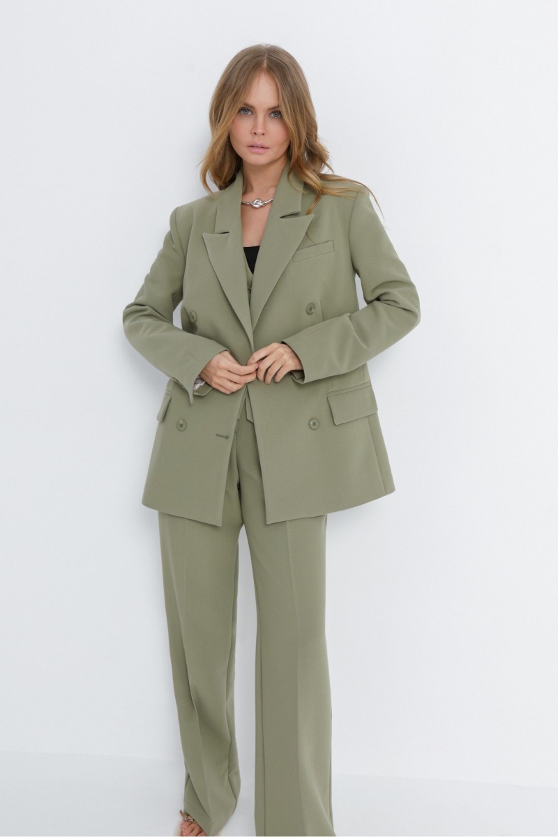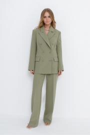 Свободный двубортный жакет из текстильной ткани. Детали: жакет свободного покроя и полуприлегающего силуэта, двубортная застежка на петли и пуговицы, отрезные бочки, пиджачный воротник, функциональные карманы, жакет на подкладке. Длина по спинке около 69 в размерах 40-46 и около 72 см в размерах 48-52, длина рукавов около 62 см