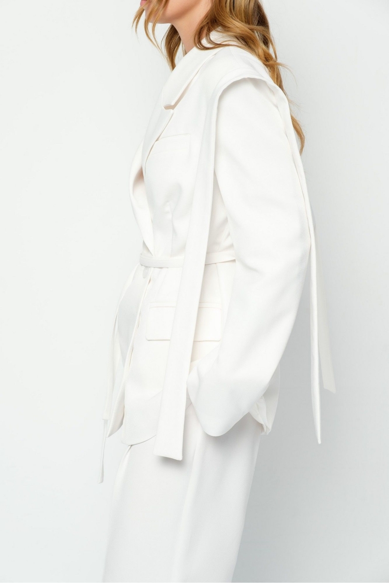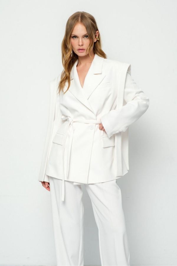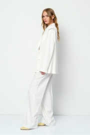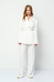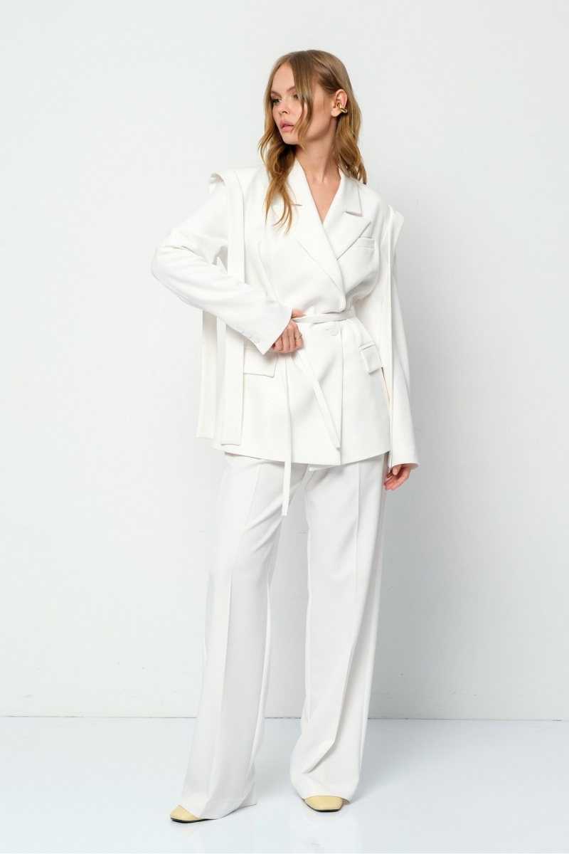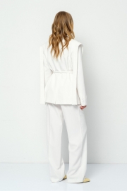 Текстильный свободный жакет с декором. Детали: жакет свободного покроя и полуприлегающего силуэта, двубортная застежка на петли и пуговицы, отрезные бочки, пиджачный воротник, функциональные карманы, съемный пояс. Жакет на подкладке. Длина жакета по спинке около 69 см в размерах 40-46 и около 72 см в размерах 48-52, длина рукавов около 62 см