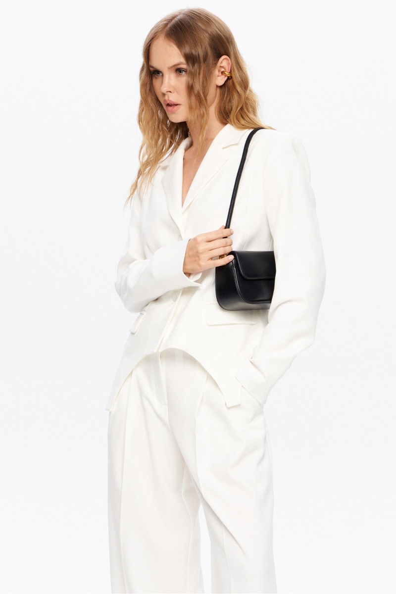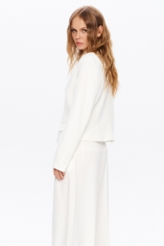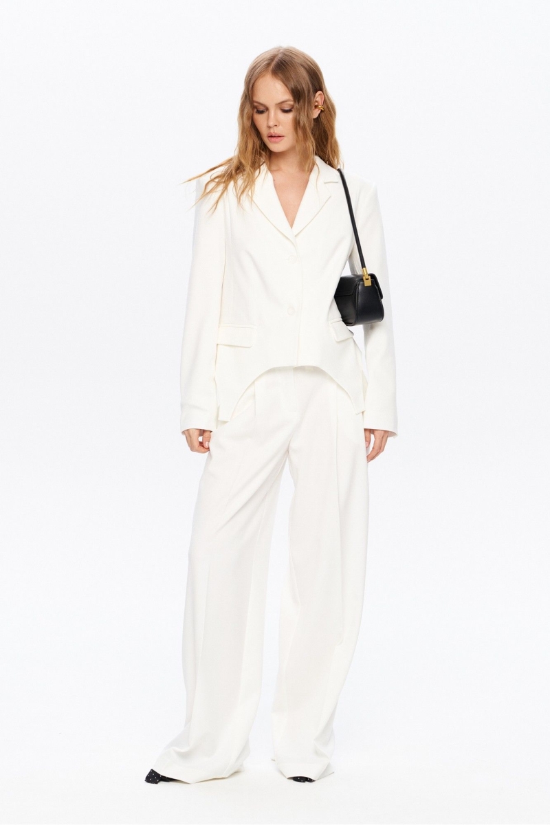 Свободный укороченный жакет с фигурным низом. Детали: полуприлегающий силуэт, пиджачный воротник, талиевые вытачки, перед с прорезными карманами, застежка на петли и пуговицы, спинка со средним швом, рукава втачные двухшовные с функциональными шлицами, жакет на подкладке. Длина по спинке около 50 см в размерах 40-46 и около 62 см в размерах 48-52, длина рукава около 61 см