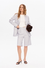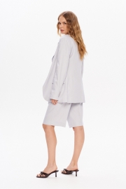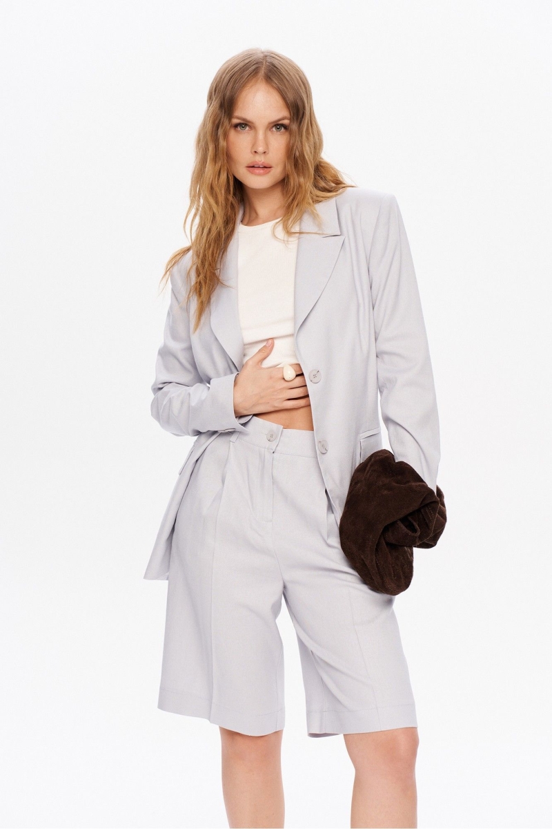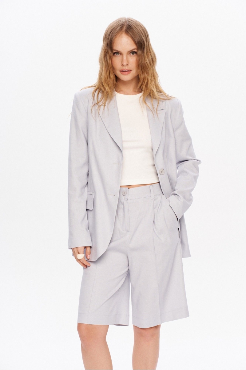 Льняной жакет полуприлегающего силуэта. Детали: пиджачный воротник, талиевые вытачки, функциональный нагрудный карман, два прорезных кармана с клапанами, застежка на петли и пуговицы, спинка со средним швом и шлицей, рукава втачные двухшовные со шлицами по низу, жакет на хлопковой подкладке. Длина по спинке около 69 см в размерах 40-46 и около 72 см в размерах 48-52, длина рукавов около 62 см