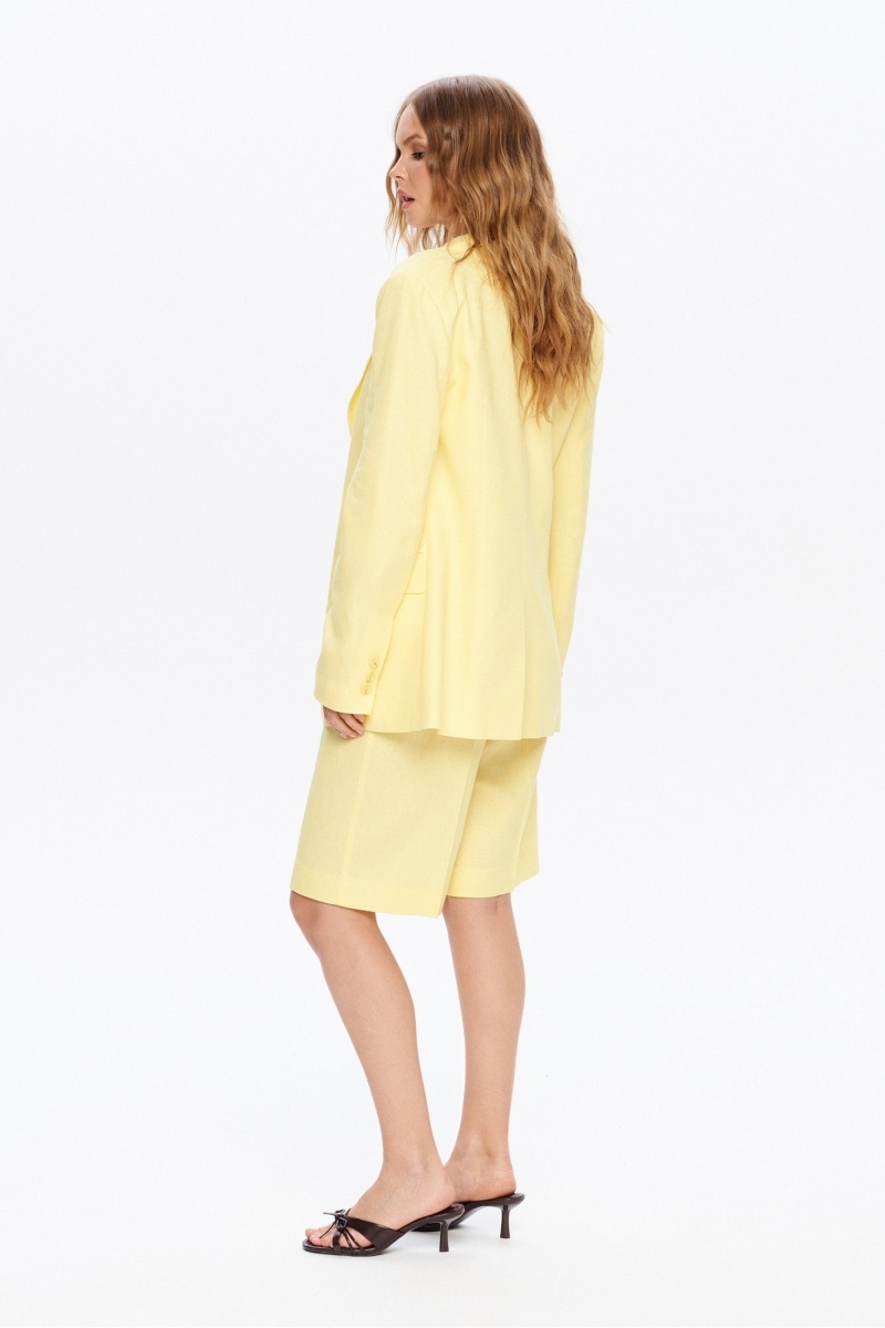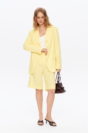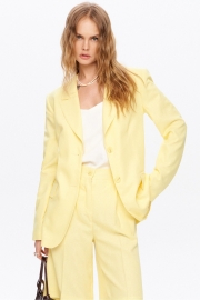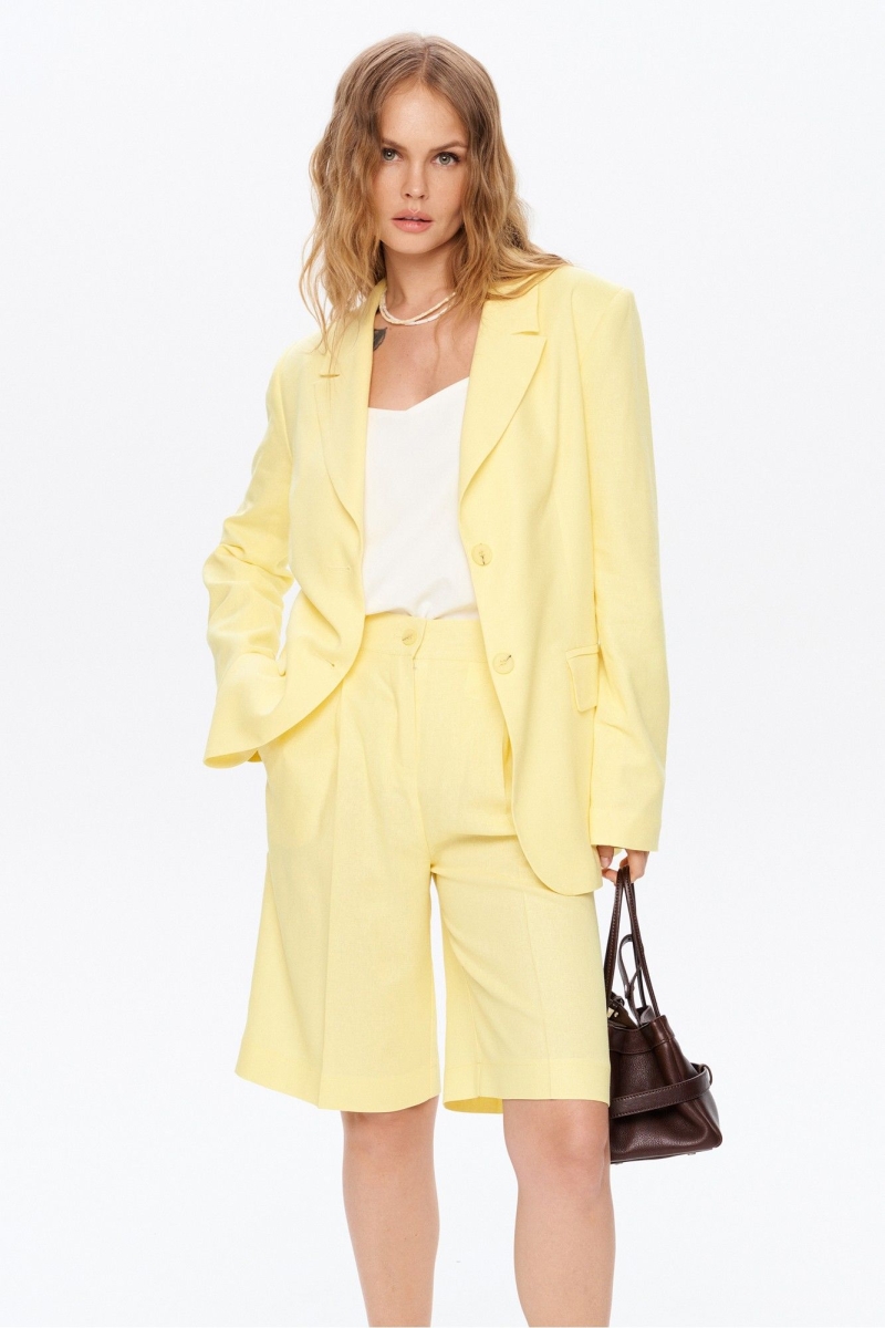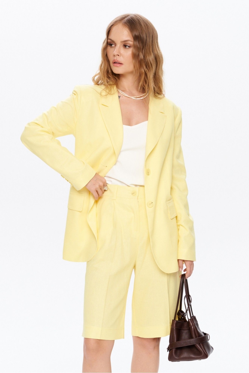 Льняной жакет полуприлегающего силуэта. Детали: пиджачный воротник, талиевые вытачки, функциональный нагрудный карман, два прорезных кармана с клапанами, застежка на петли и пуговицы, спинка со средним швом и шлицей, рукава втачные двухшовные со шлицами по низу, жакет на хлопковой подкладке. Длина по спинке около 69 см в размерах 40-46 и около 72 см в размерах 48-52, длина рукавов около 62 см