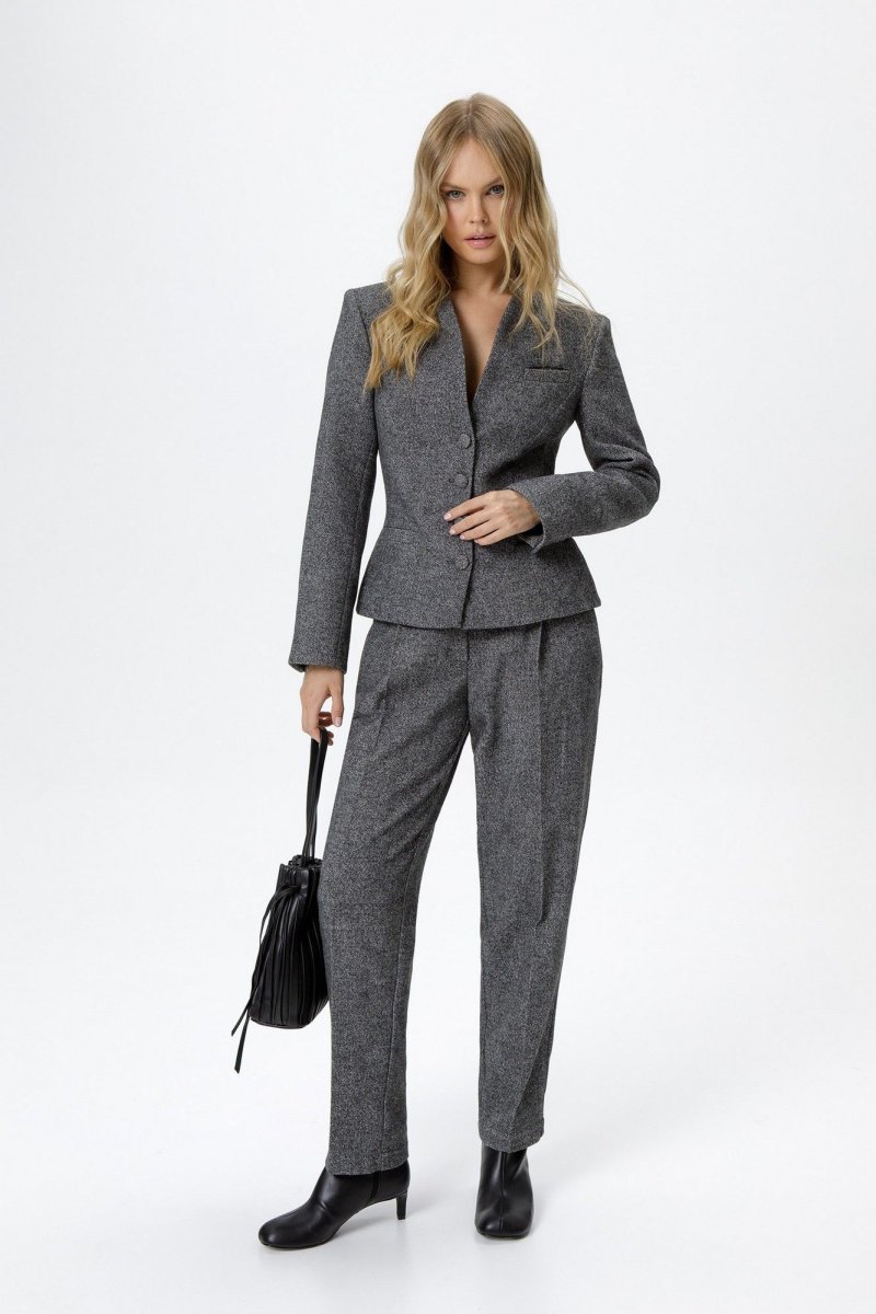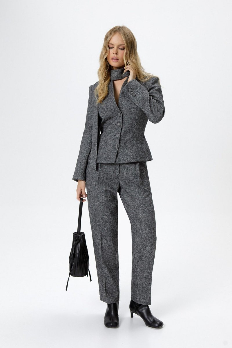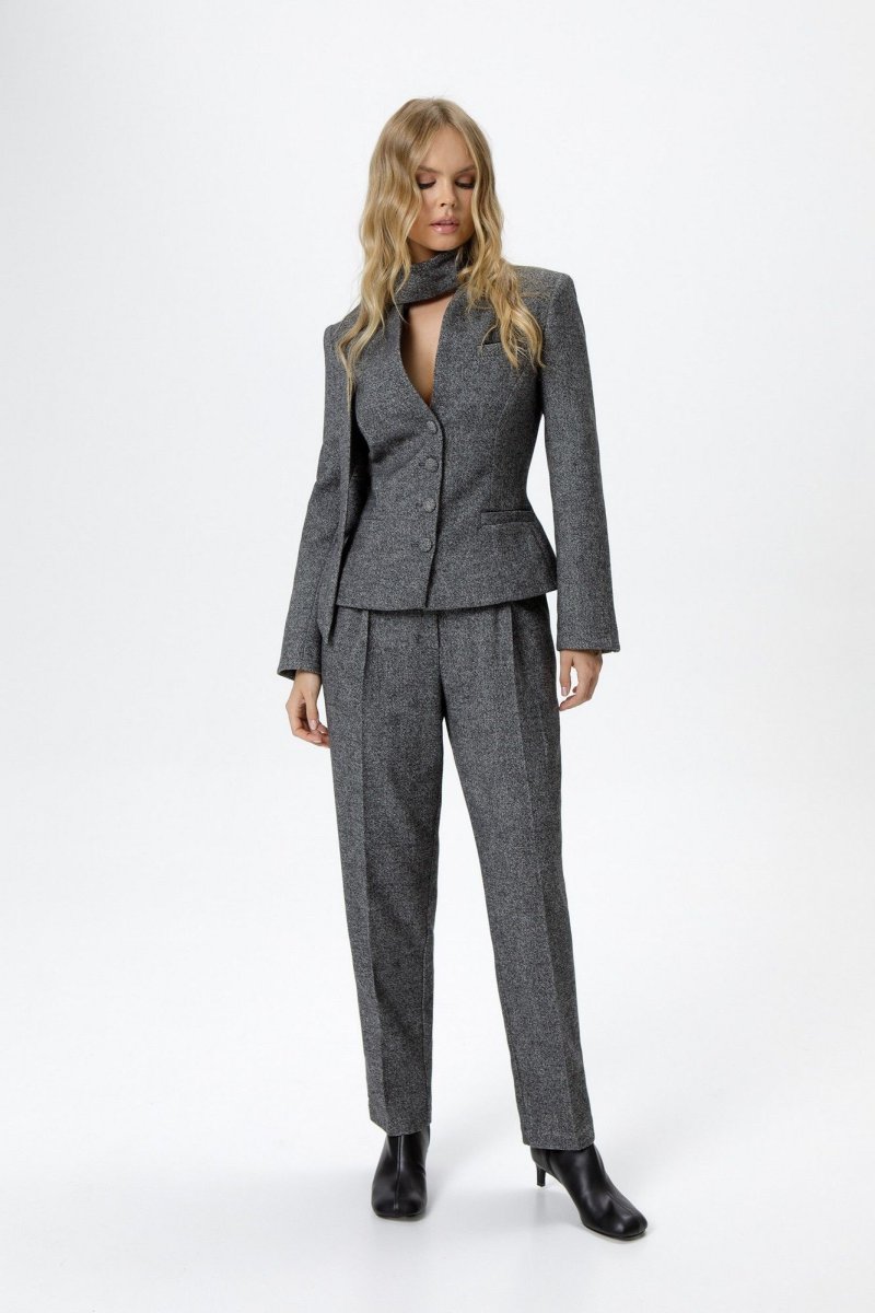 Приталенный жакет с воротником-стойкой и съемным шарфиком.