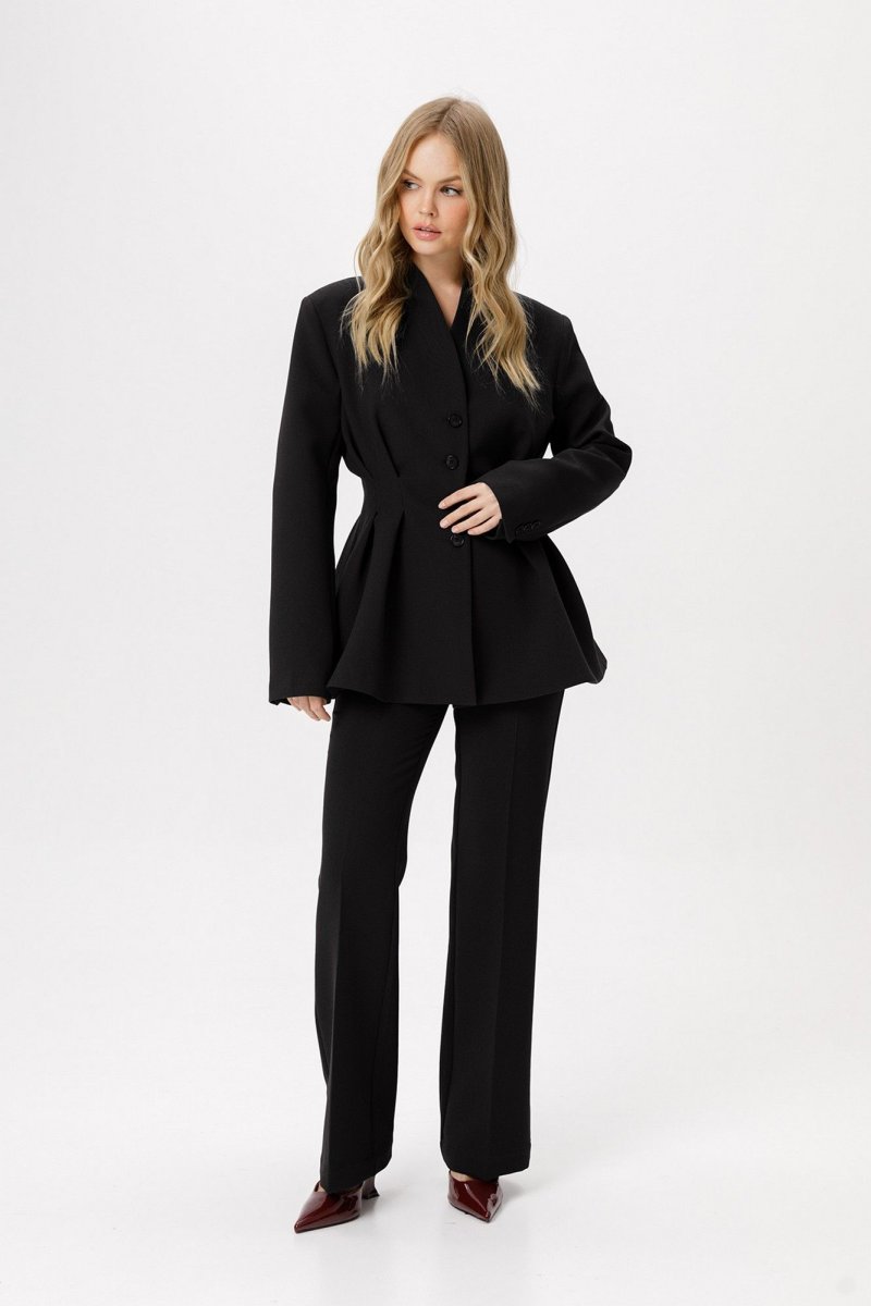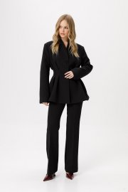 Детали: полуприлегающий силуэт с расширенными плечами, цельнокроеный воротник-стойка, застежка на петли и пуговицы, рукава втачные двушхшовные, жакет на подкладке