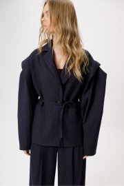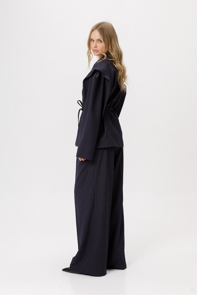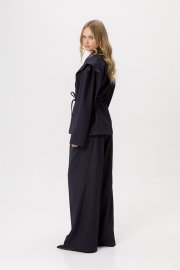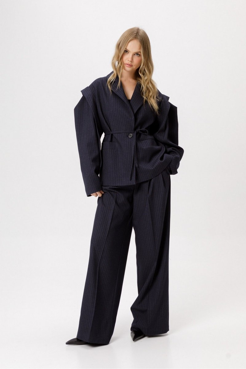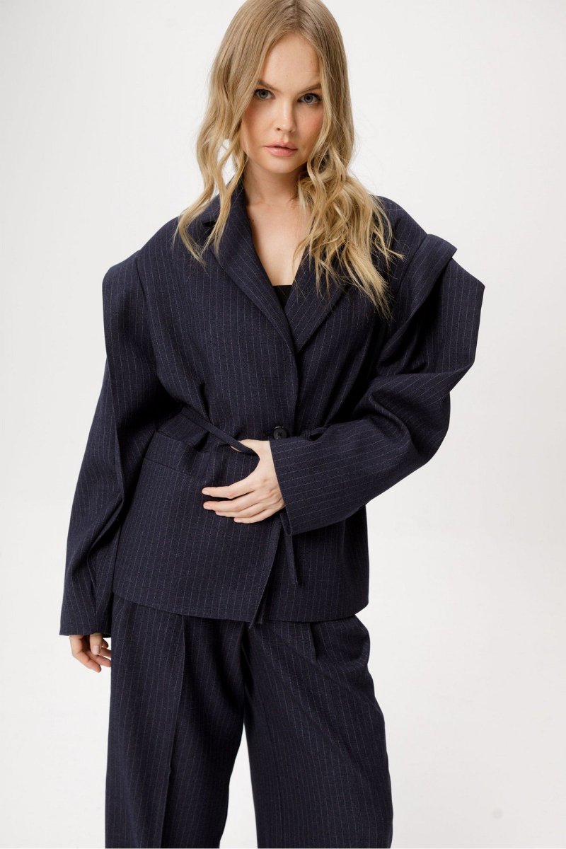 Детали: прямой силуэт, удлинённая линия плеча, втачной одношовный рукав с ассиметричными складками, функциональные карманы, центральная застёжка на 1 пуговицу, жакет на подкладке.