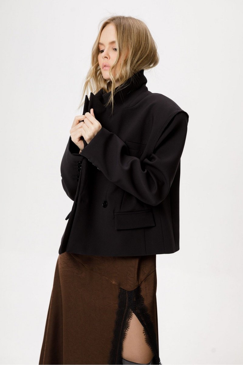 Детали: жакет прямого силуэта, пиджачный воротник, двубортная застежка на две петли и пуговицы, функциональные карманы, спинка с фигурной кокеткой, рукава втачные, жакет на подкладке.