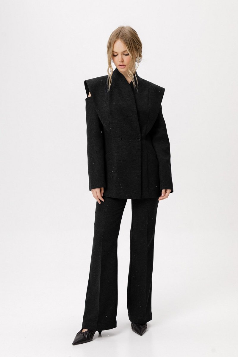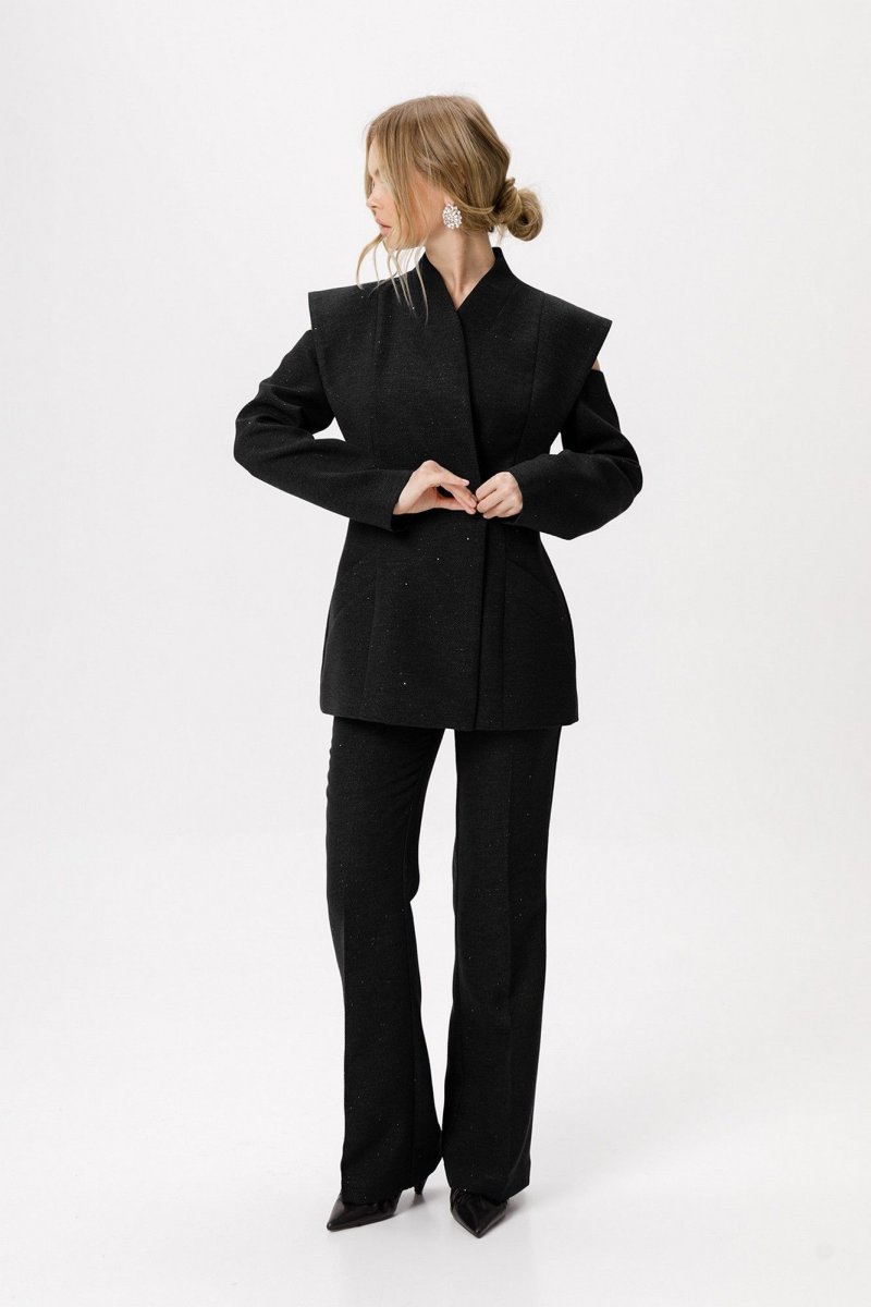 Детали: полуприлегающий силуэт, цельнокроеный воротник-стойка, двубортная застёжка на петли и пуговицы, рельефные швы переда и спинки с декоративным элементом, рукава длинные с вырезами по верху, функциональные карманы, жакет на подкладке.