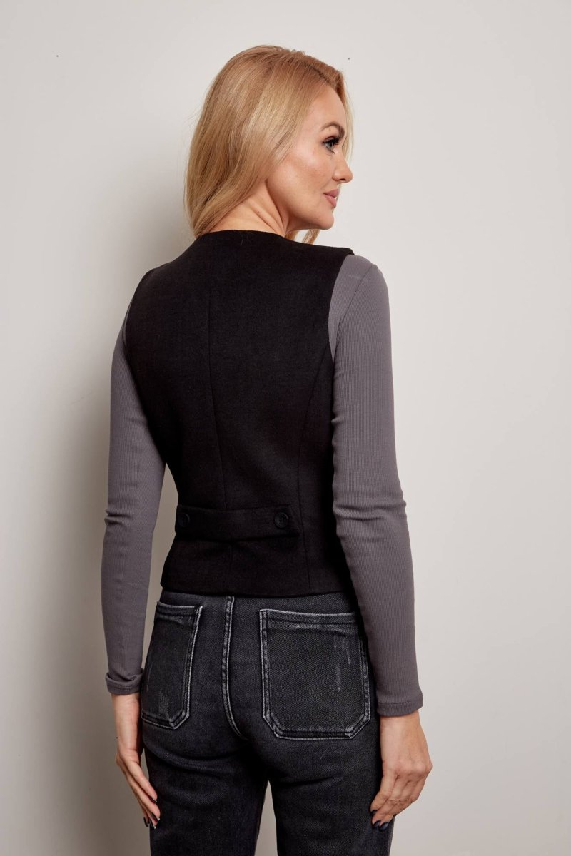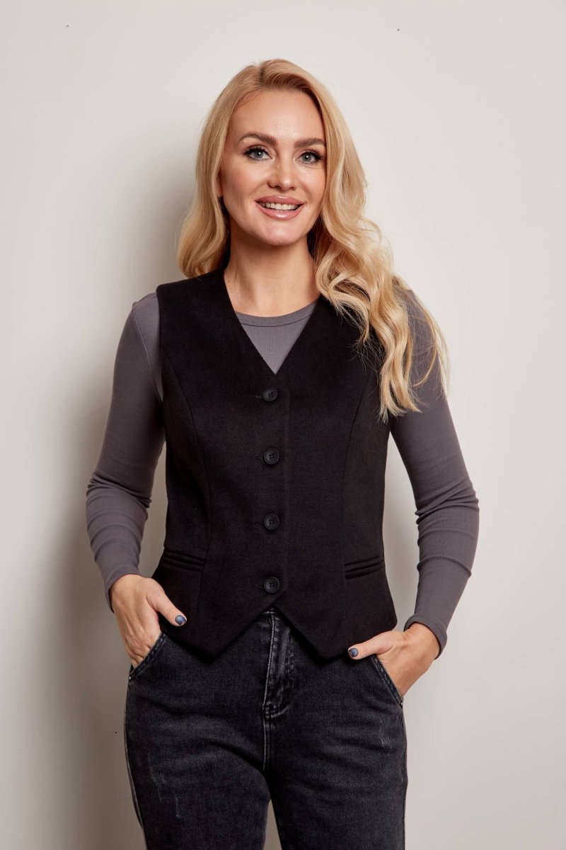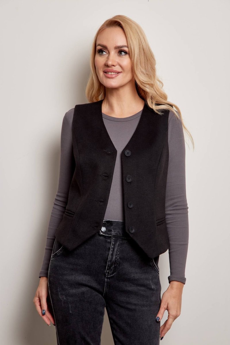 Жилет женский на подкладке из тёплой ткани, с застёжкой спереди на петли и пуговицы, с вертикальными рельефами по перпеду и спинке, с карманами " обманками" по переду, с хлястиком по спинке.