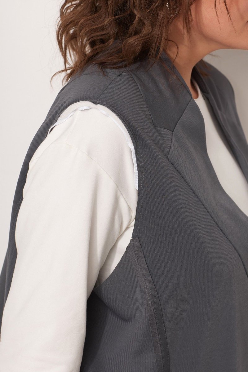 Жилет выполнен из струящегося текстиля со стрейчем, средней плотности с саржевым плетением. Для создания современного образа использованы открытые срезы. Жилет с имитацией отложного воротника с лацканом, с плечевыми накладками обработанными по краю киперной тесьмой с открытым срезом.