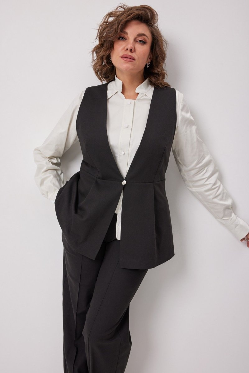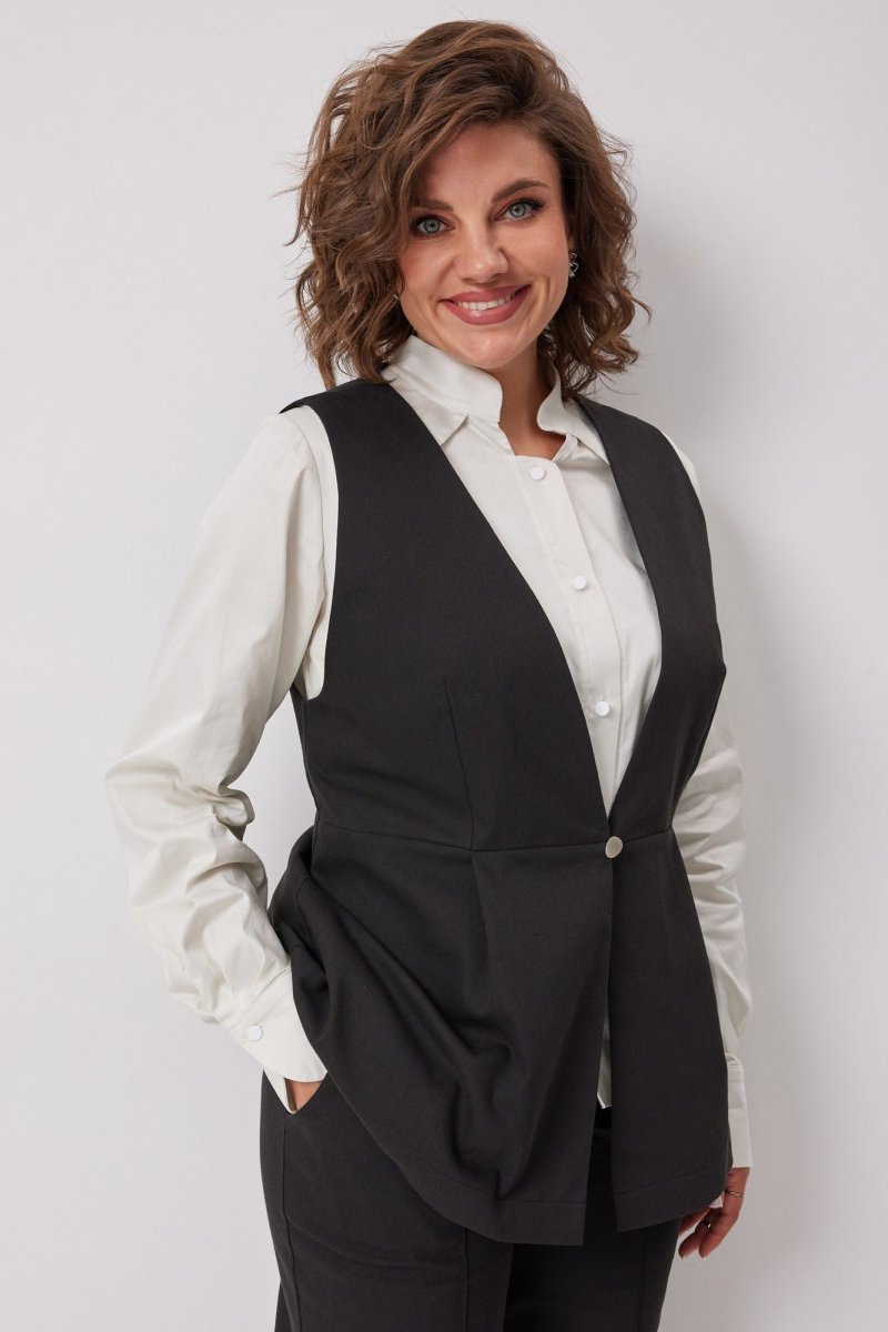 Жилет приталенного силуэта, без подкладки с застёжкой на металлическую пуговицу. Посадка по фигуре идеальна благодаря выверенным лекалам. Акцент на талии создают односторонние складки по линии переда. Жилет отлично сочетается как элегантной блузой, так и с лонгсливом, футболкой для создания менее формального образа.