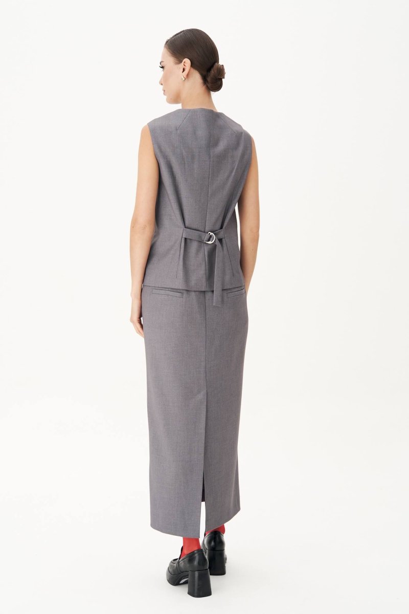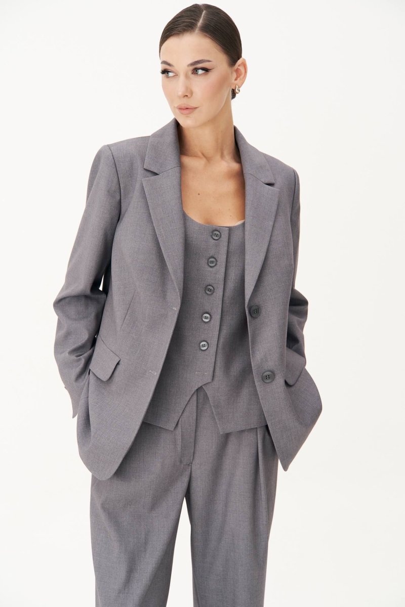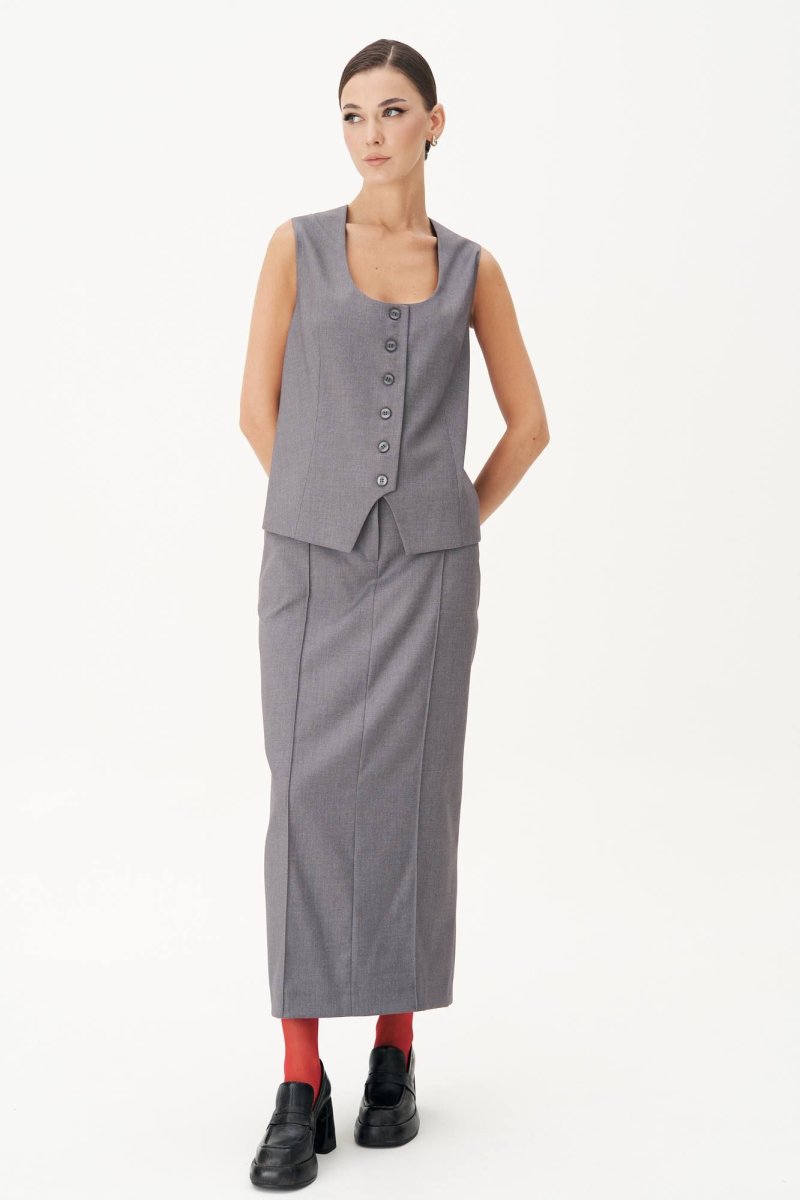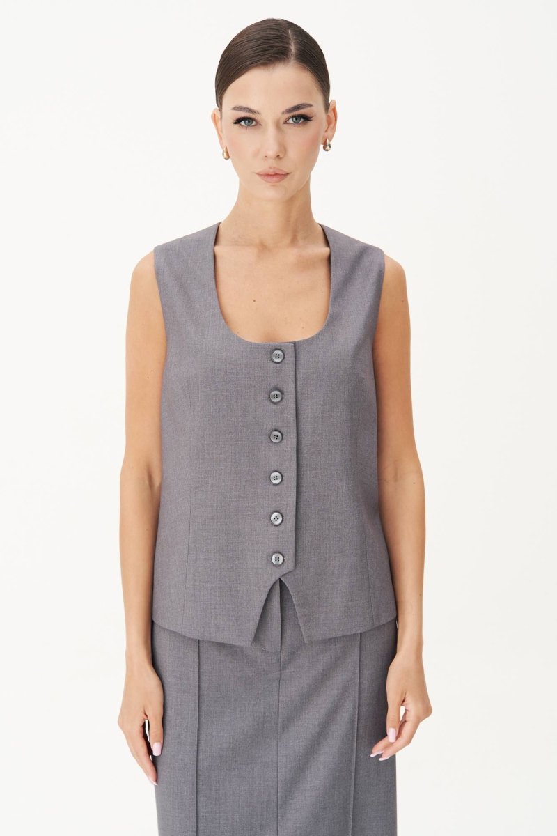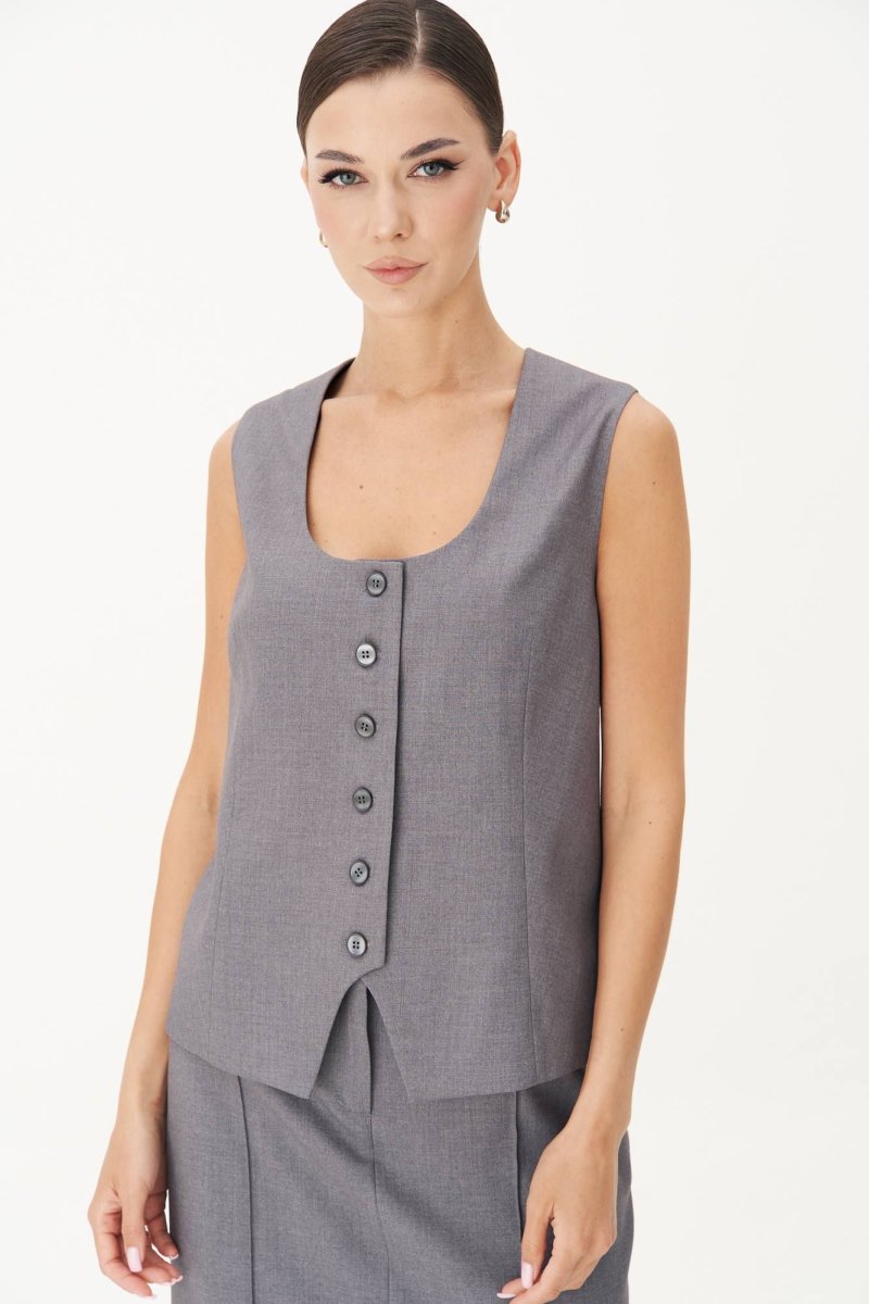 Классический удлинённый жилет полуприлегающего силуэта с центральной застёжкой на петли и пуговицы, нагрудной вытачкой от линии низа, фигурным бортом и овальным вырезом. Спина с центральным швом, талиевой и плечевой вытачкой и отделочным хлястиком, подчёркивающим талию, регулирующимся поясом с полукольцами.