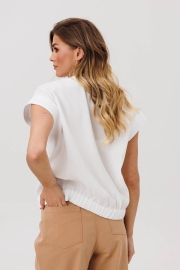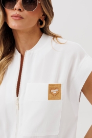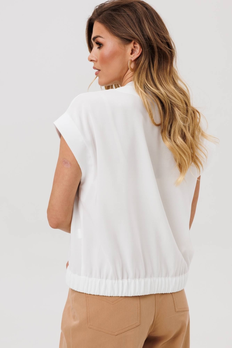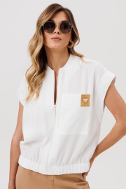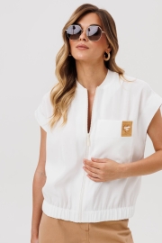 Жилет (бомбер) свободного силуэта из легкой летней вискоззной ткани. Перед на застежке на молнию, горловина обработана довязом. На левой части переда настрочен карман декорированый нашивкой. Бомбер по низу на резинке. Пройма обработана обтачкой. Длина - 60 см.
