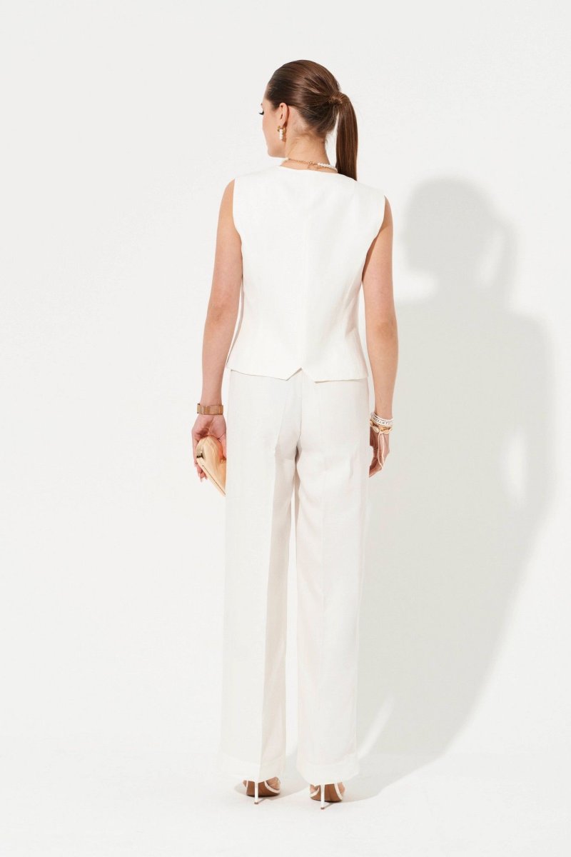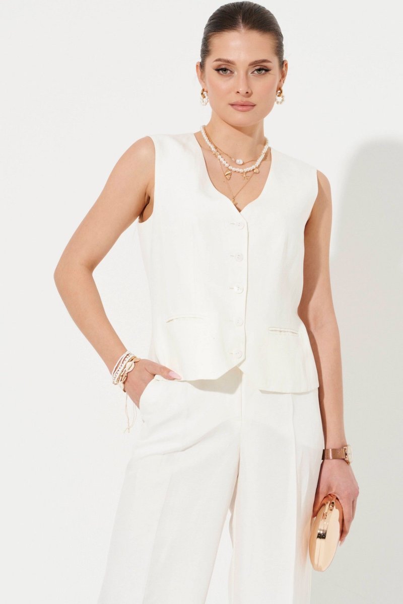 Жилет женский в классическом стиле бренда Ketty - современная база женского гардероба. Классический жилет выполнен из льняной ткани с V-образным вырезом, полуприлегающего кроя, подходит для образов в офис, в университет, в школу, на каждый день. Жилетка короткая на пуговицах имеет подкладку из вискозы, ее можно надевать под пиджак как первый слой (тренд сезона), под кардиган, а также сочетать с шелковыми топами, блузками женскими, водолазками, рубашками. Дополни жилеткой классическую прямую юбку, юбку мини, женские прямые брюки или брюки палаццо и даже джинсы!