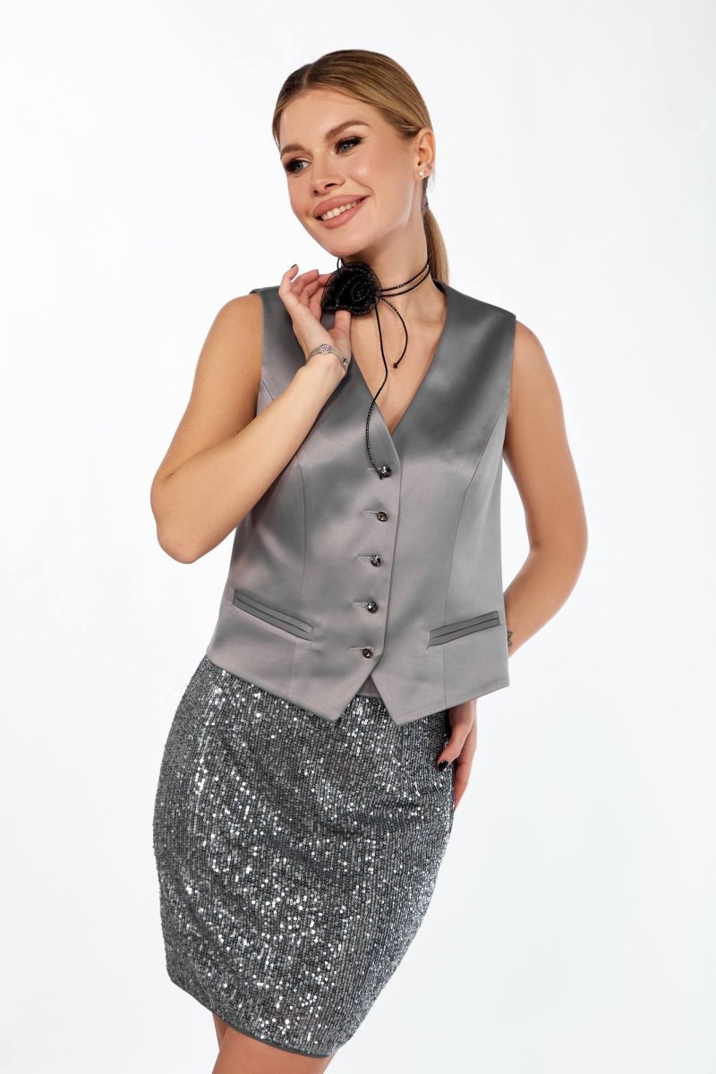 Нарядная жилетка из атласной ткани, со сьемным украшением в комплекте. Полуприлегающего силуэта, на подкладке, по переду рельефные швы и карманы в рамку. Вырез горловины V-образный, застежка на петли и пуговицы. Спинка со средним швом и талиевыми вытачками.