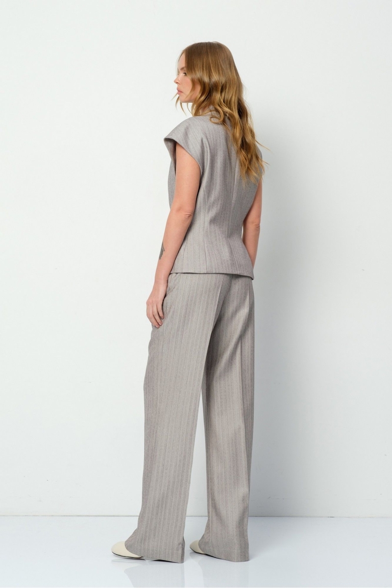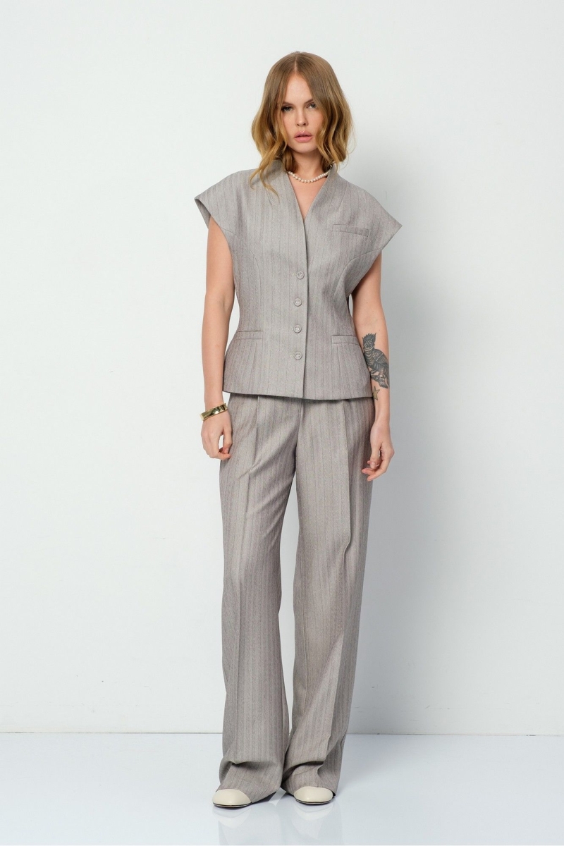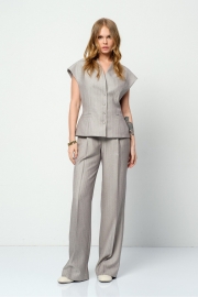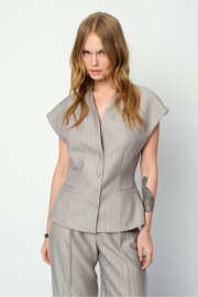 Приталенный жилет с воротником-стойкой из текстильной ткани с рисунком «ёлочка». Детали: полуприлегающий силуэт, цельнокроеный воротник-стойка, рельефные швы переда и спинки, функциональные карманы, застежка на петли и пуговицы, жилет на подкладке. Длина по спинке около 54 см в размерах 40-46 и около 56 см в размерах 48-52.
