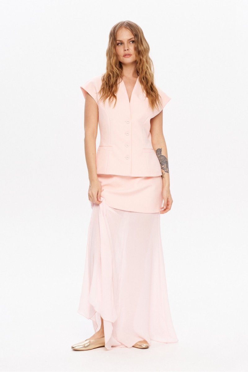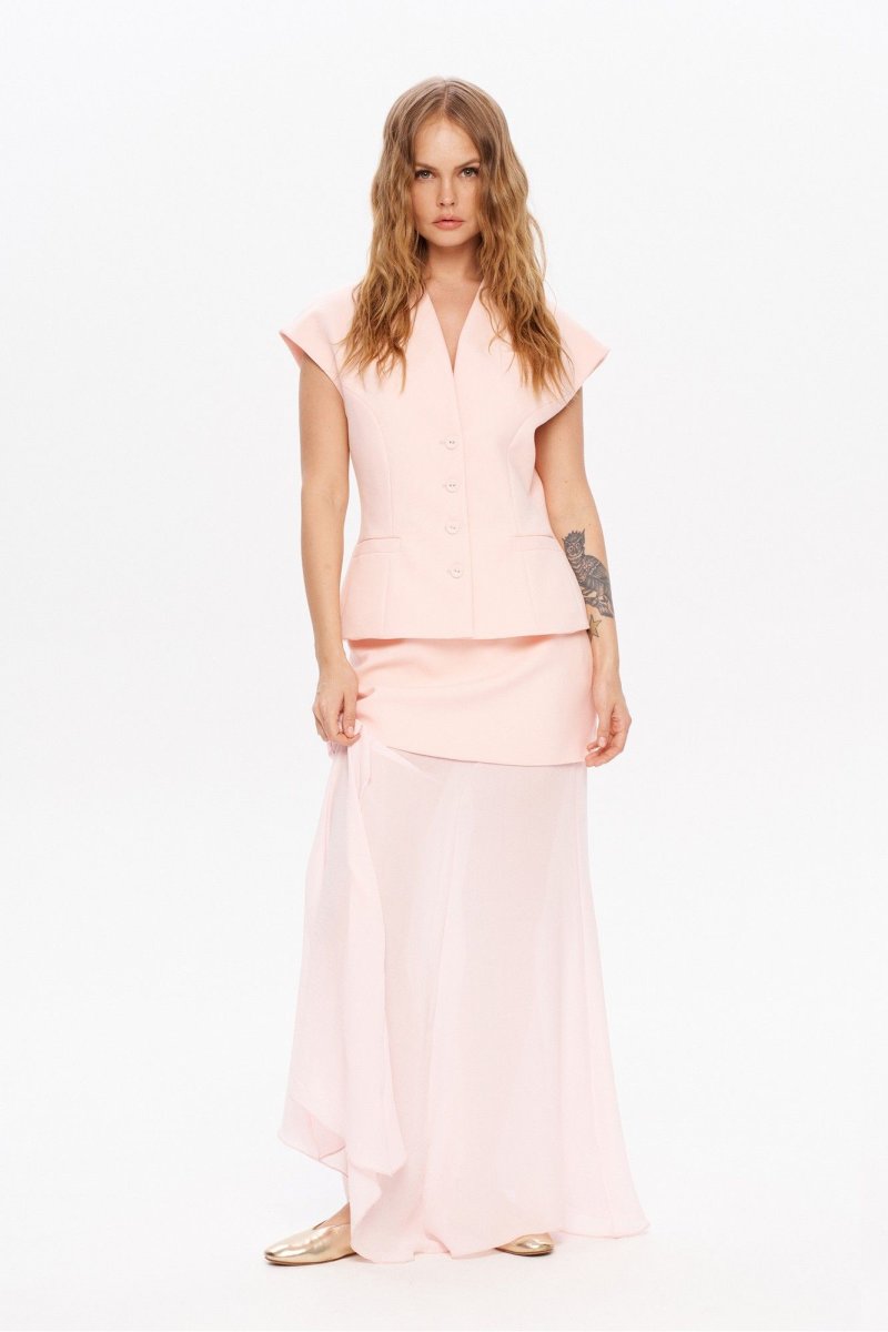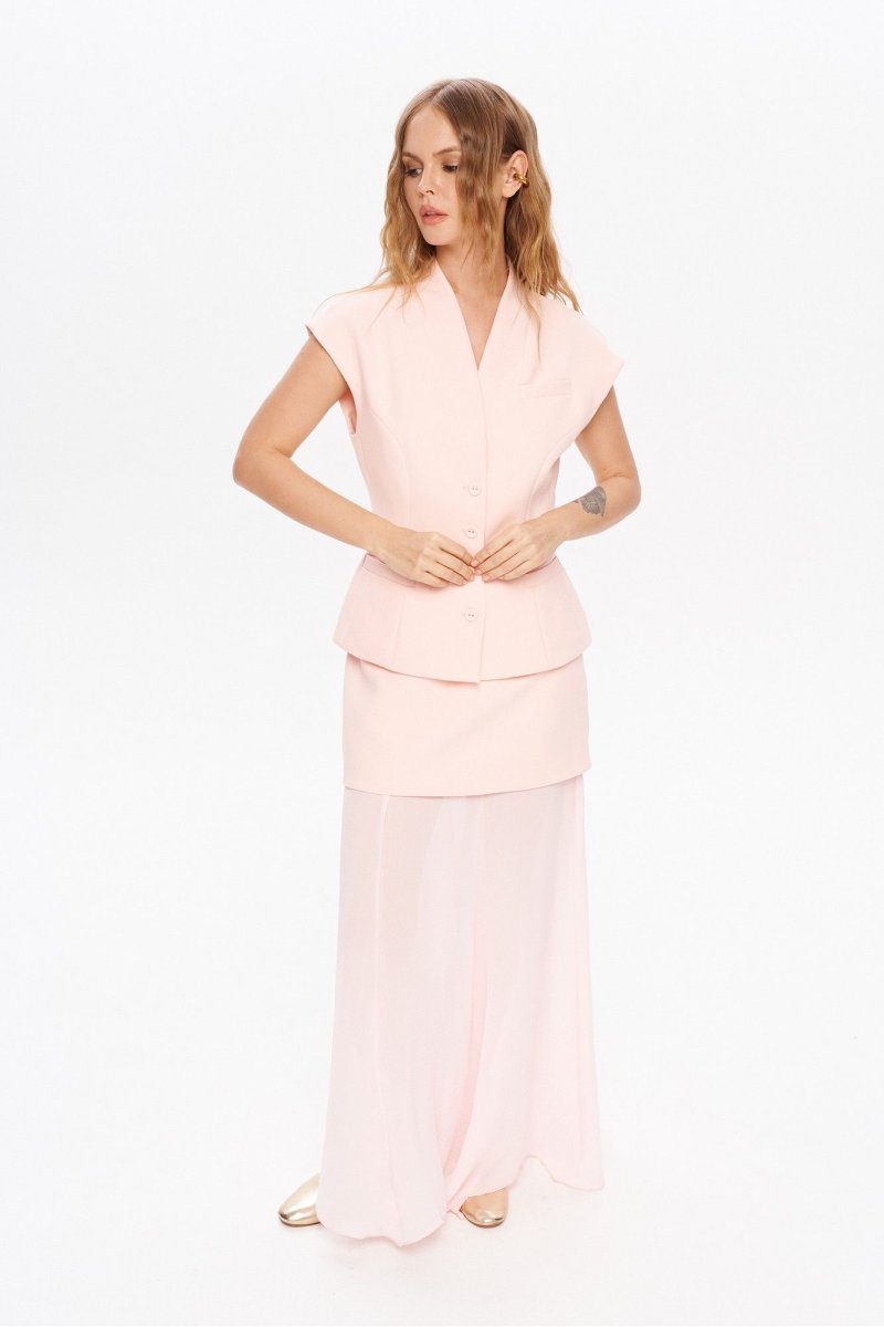 Приталенный жилет с воротником-стойкой. Детали: полуприлегающий силуэт, цельнокроеный воротник-стойка, рельефные швы переда и спинки, функциональные карманы, застежка на петли и пуговицы, жилет на подкладке Длина по спинке около 54 см в размерах 40-46 и около 56 см в размерах 48-53